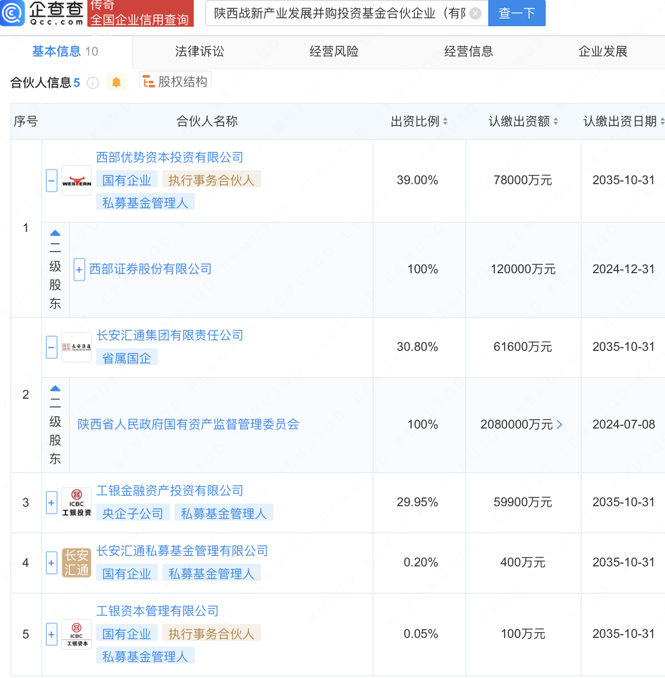 企查查APP显示,近日,陕西战新产业发展并购投资基金合伙企业(有限合伙)成立,出资额20亿元,经营范围包含:以自有资金从事投资活动;创业投资(限投资未上市企业);私募股权投资基金管理、创业投资基金管理服务。企查查股权穿透显示,该企业由西部证券(002673)全资子公司西部优势资本投资有限公司、陕西省人民政府国有资产监督管理委员会旗下长安汇通集团有限责任公司、工银金融资产投资有限公司等共同出资。