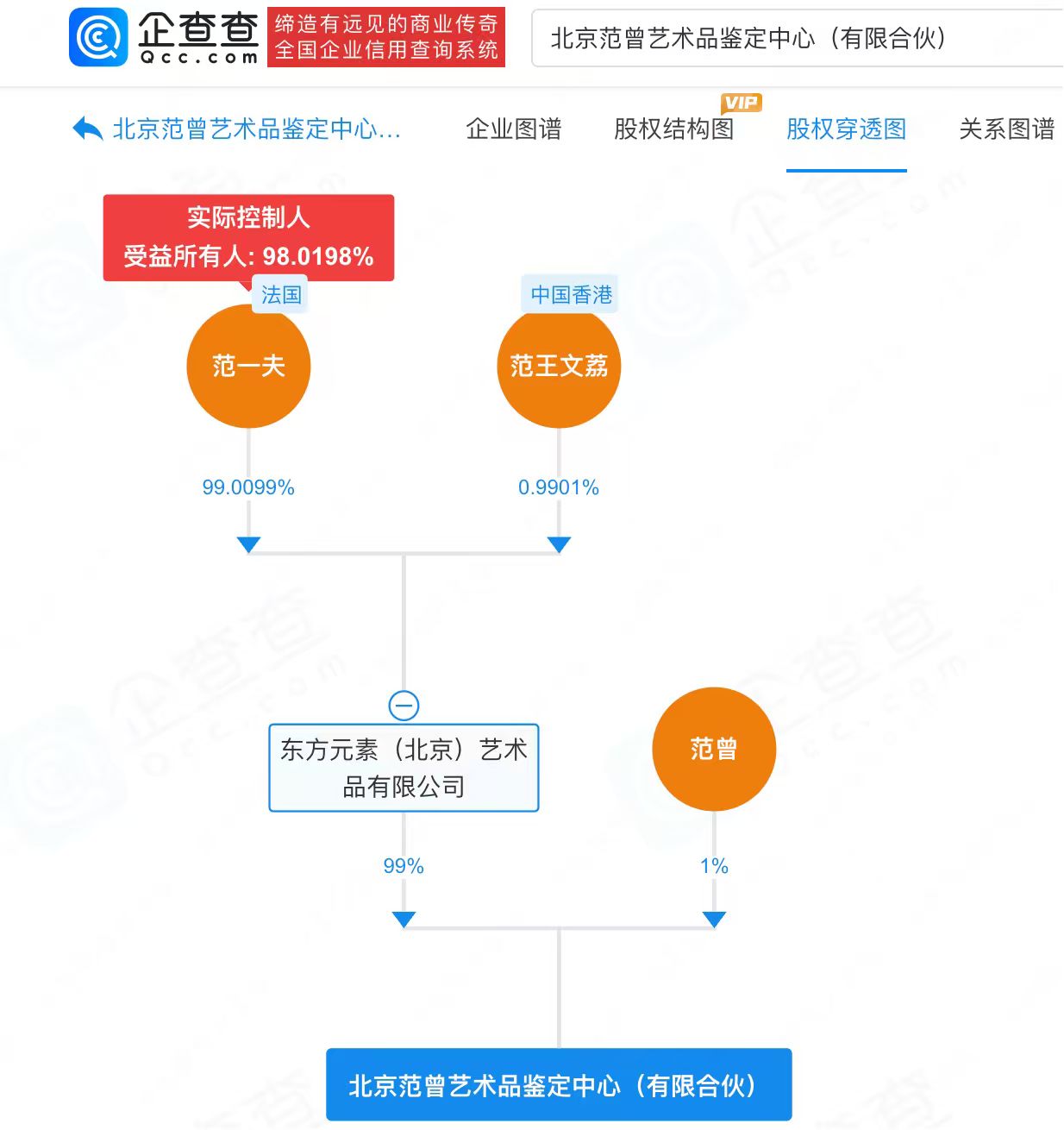 据企查查信息显示,范曾名下关联北京范曾艺术品有限公司等多家公司,于12月2日与妻子徐萌出资成立十翼范曾(北京)文化艺术有限公司,徐萌、范曾分别持股51%、49%。此外,范曾持有北京范曾艺术品有限公司、北京范曾艺术品鉴定中心(有限合伙)1%股权,前者由范仲达持股60%,后者由范一夫间接持股98%。