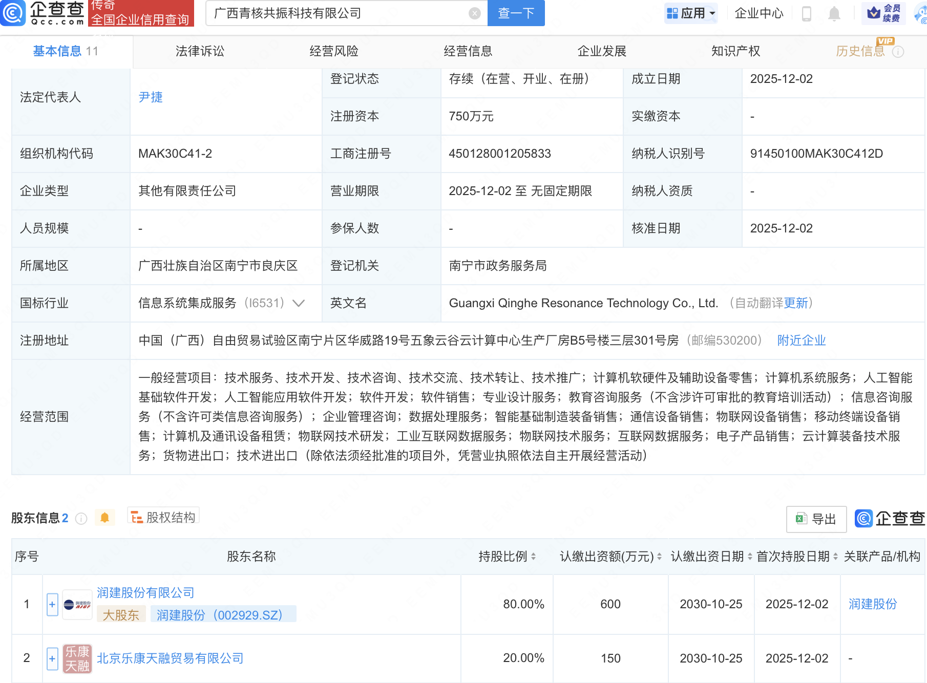 企查查APP显示,近日,广西青核共振科技有限公司成立,经营范围包含:人工智能基础软件开发;人工智能应用软件开发;物联网技术研发;工业互联网数据服务;物联网技术服务等。企查查股权穿透显示,该公司由润建股份(002929)等共同持股。