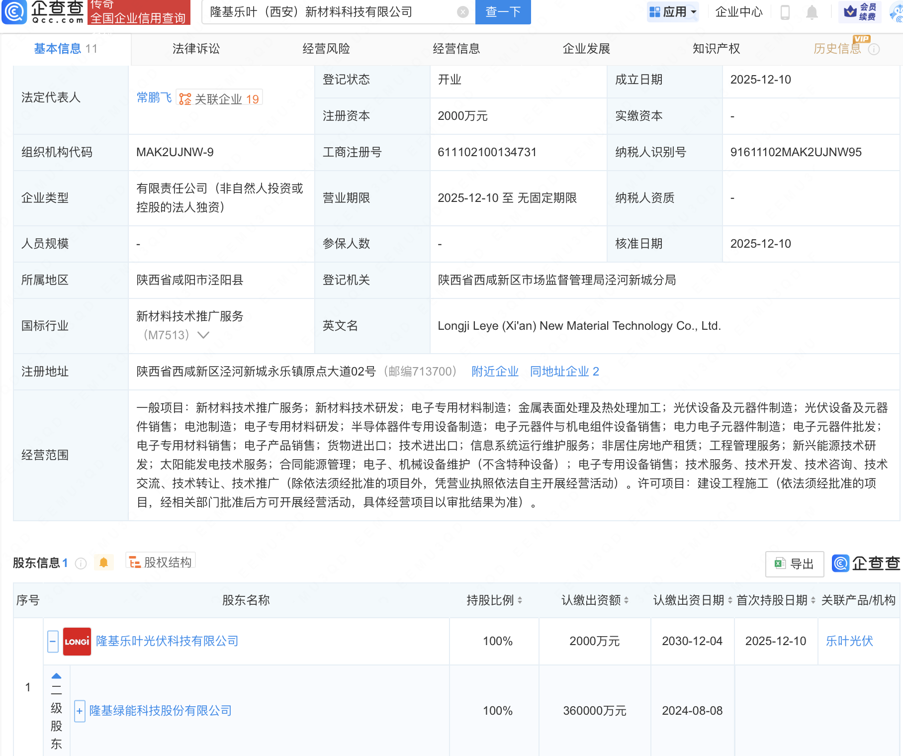 企查查APP显示,近日,隆基乐叶(西安)新材料科技有限公司成立,注册资本2000万元,经营范围包含:电池制造;电子专用材料研发;半导体器件专用设备制造;电子元器件与机电组件设备销售等。企查查股权穿透显示,该公司由隆基绿能(601012)间接全资持股。