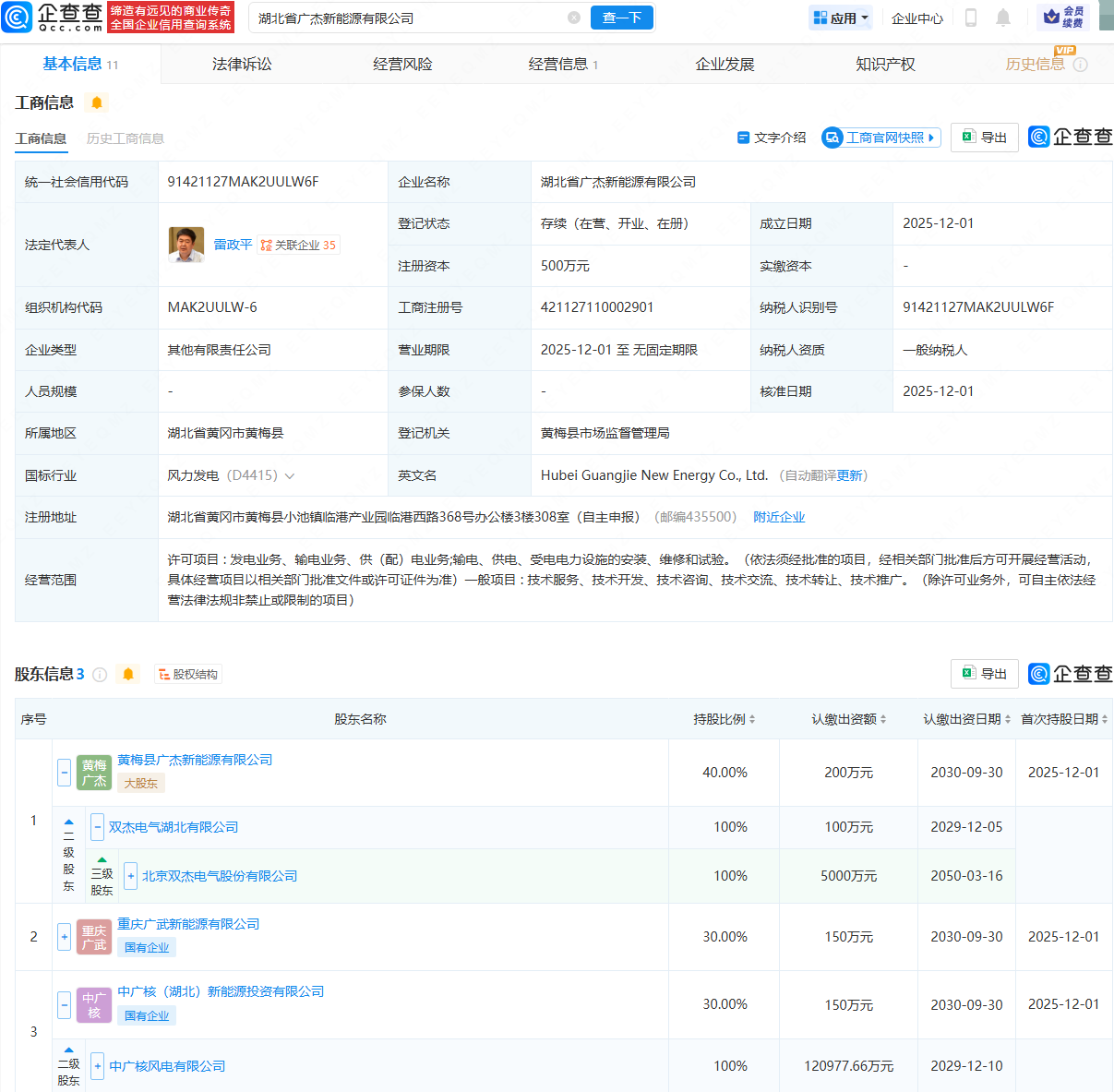 企查查APP显示,近日,湖北省广杰新能源有限公司成立,法定代表人为雷政平,经营范围包含:发电业务、输电业务、供(配)电业务;输电、供电、受电电力设施的安装、维修和试验等。企查查股权穿透显示,该公司由双杰电气(300444)旗下黄梅县广杰新能源有限公司、中广核风电有限公司旗下中广核(湖北)新能源投资有限公司等共同持股。