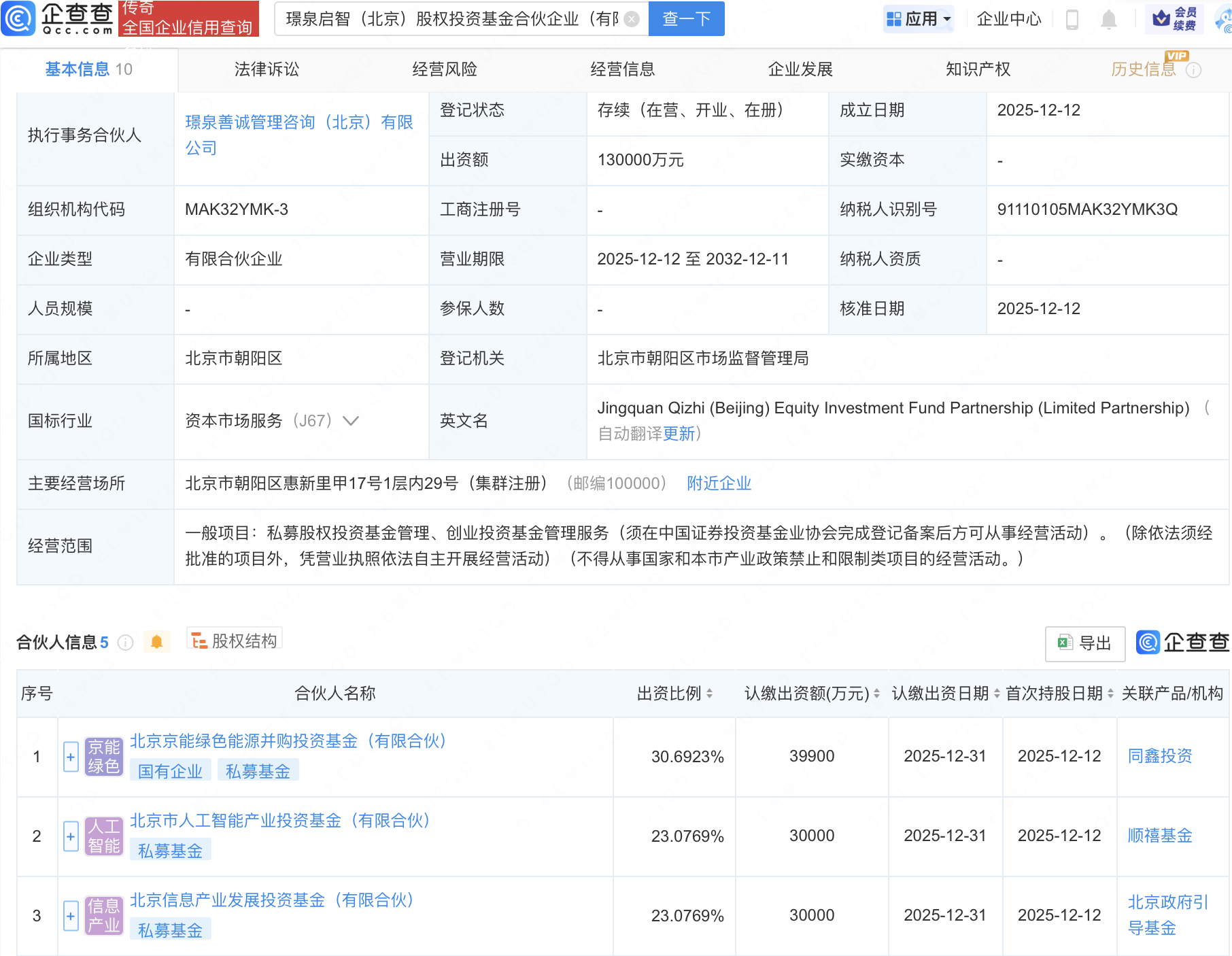企查查APP显示,近日,璟泉启智(北京)股权投资基金合伙企业(有限合伙)成立,出资额13亿元,经营范围包含:私募股权投资基金管理、创业投资基金管理服务。企查查股权穿透显示,该企业由北京京能绿色能源并购投资基金(有限合伙)、北京市人工智能产业投资基金(有限合伙)等共同出资。