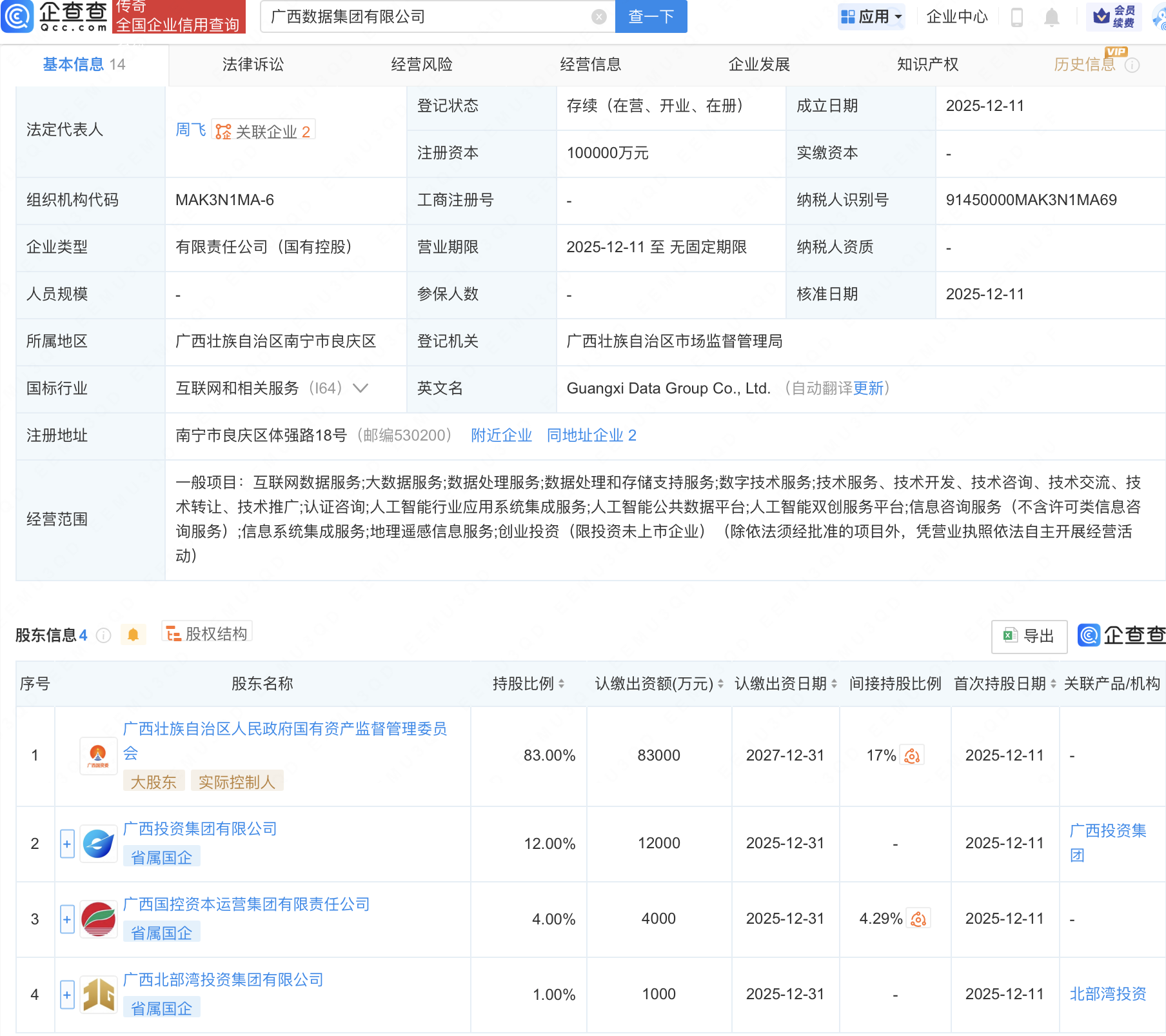 企查查APP显示,近日,广西数据集团有限公司成立,注册资本10亿元,经营范围包含:人工智能行业应用系统集成服务;人工智能公共数据平台;人工智能双创服务平台等。企查查股权穿透显示,该公司由广西壮族自治区人民政府国有资产监督管理委员会、广西投资集团有限公司等共同持股。