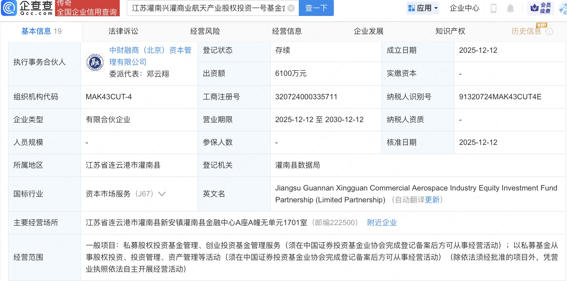 企查查APP显示,近日,江苏灌南兴灌商业航天产业股权投资一号基金合伙企业(有限合伙)成立,经营范围包含:私募股权投资基金管理、创业投资基金管理服务等。企查查股权穿透显示,该企业由连云港灌河金融控股集团有限公司等共同出资。