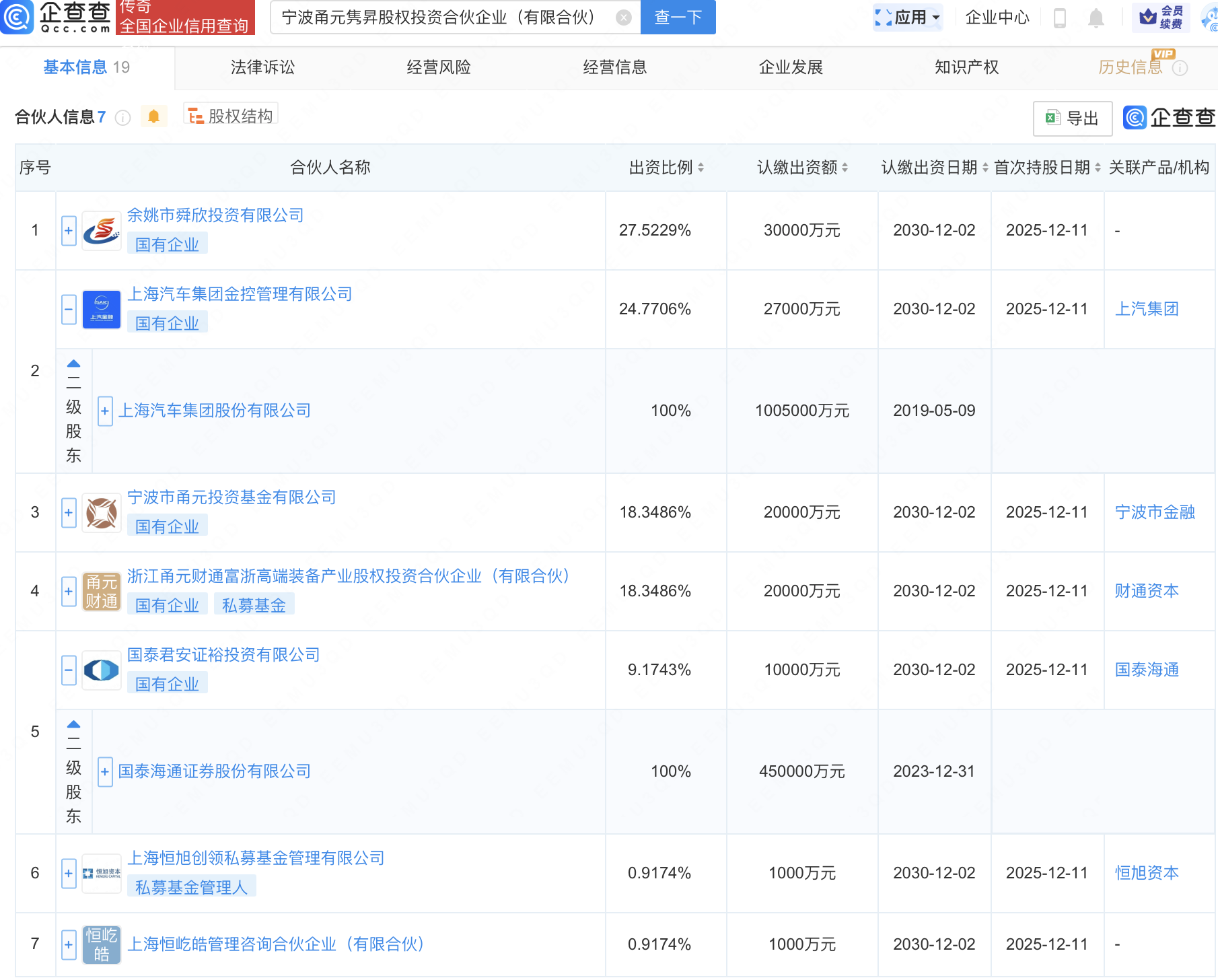 企查查APP显示,近日,宁波甬元隽昇股权投资合伙企业(有限合伙)成立,出资额10.9亿元,经营范围包含:以私募基金从事股权投资、投资管理、资产管理等活动。企查查股权穿透显示,该企业由上汽集团(600104)全资子公司上海汽车集团金控管理有限公司、国泰海通(601211)全资子公司国泰君安证裕投资有限公司等共同持股。
