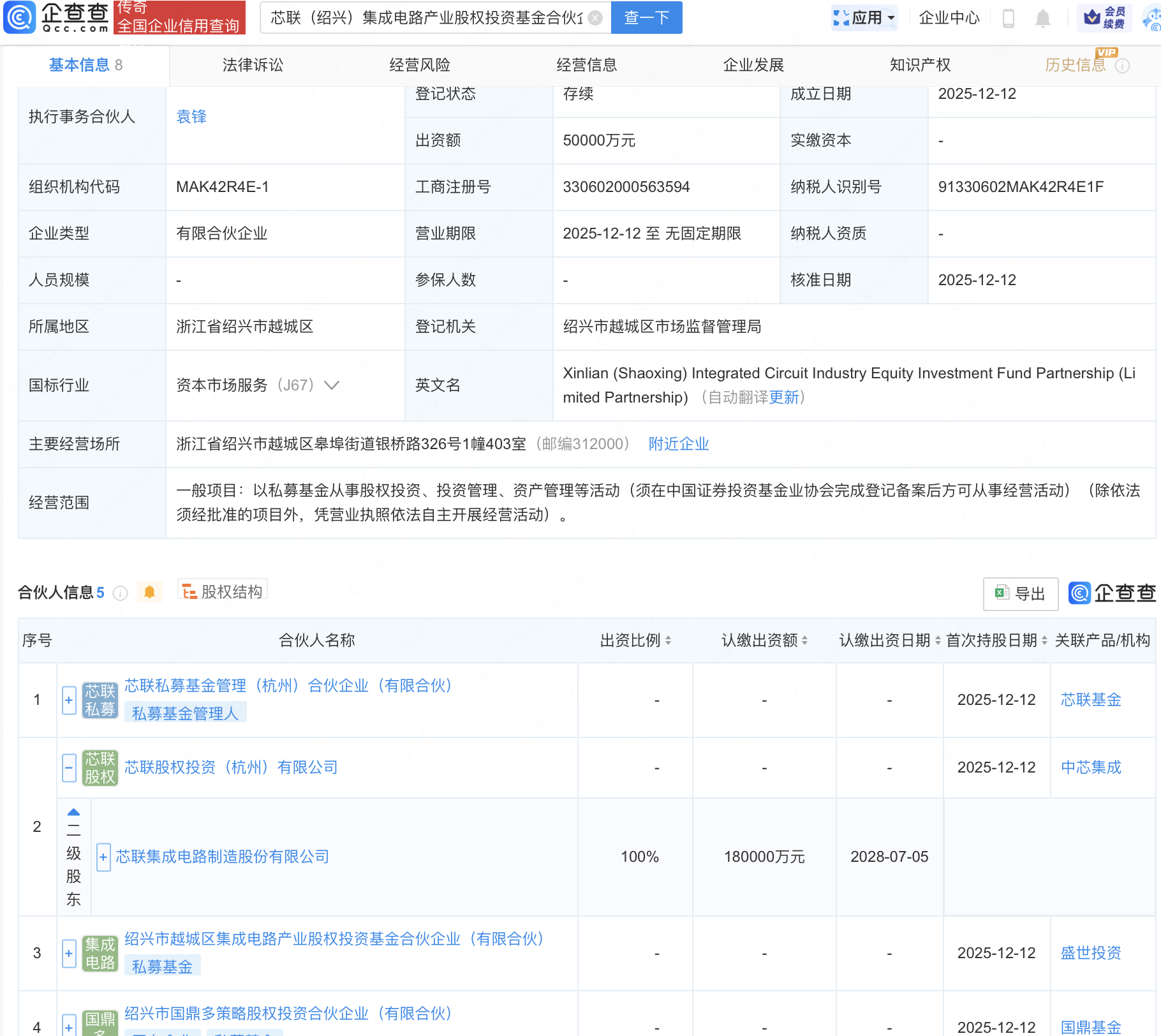 企查查APP显示,近日,芯联(绍兴)集成电路产业股权投资基金合伙企业(有限合伙)成立,出资额5亿元,经营范围包含:以私募基金从事股权投资、投资管理、资产管理等活动。企查查股权穿透显示,该企业由芯联集成(688469)全资子公司芯联股权投资(杭州)有限公司等共同出资。