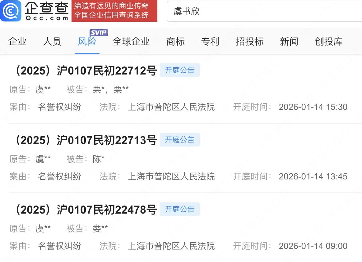 企查查APP显示,近日,虞书欣分别与娄某、陈某、栗某等相关名誉权纠纷案件新增开庭公告,原告均为虞书欣,上述三起案件将于2026年1月14日在上海市普陀区人民法院开庭审理。