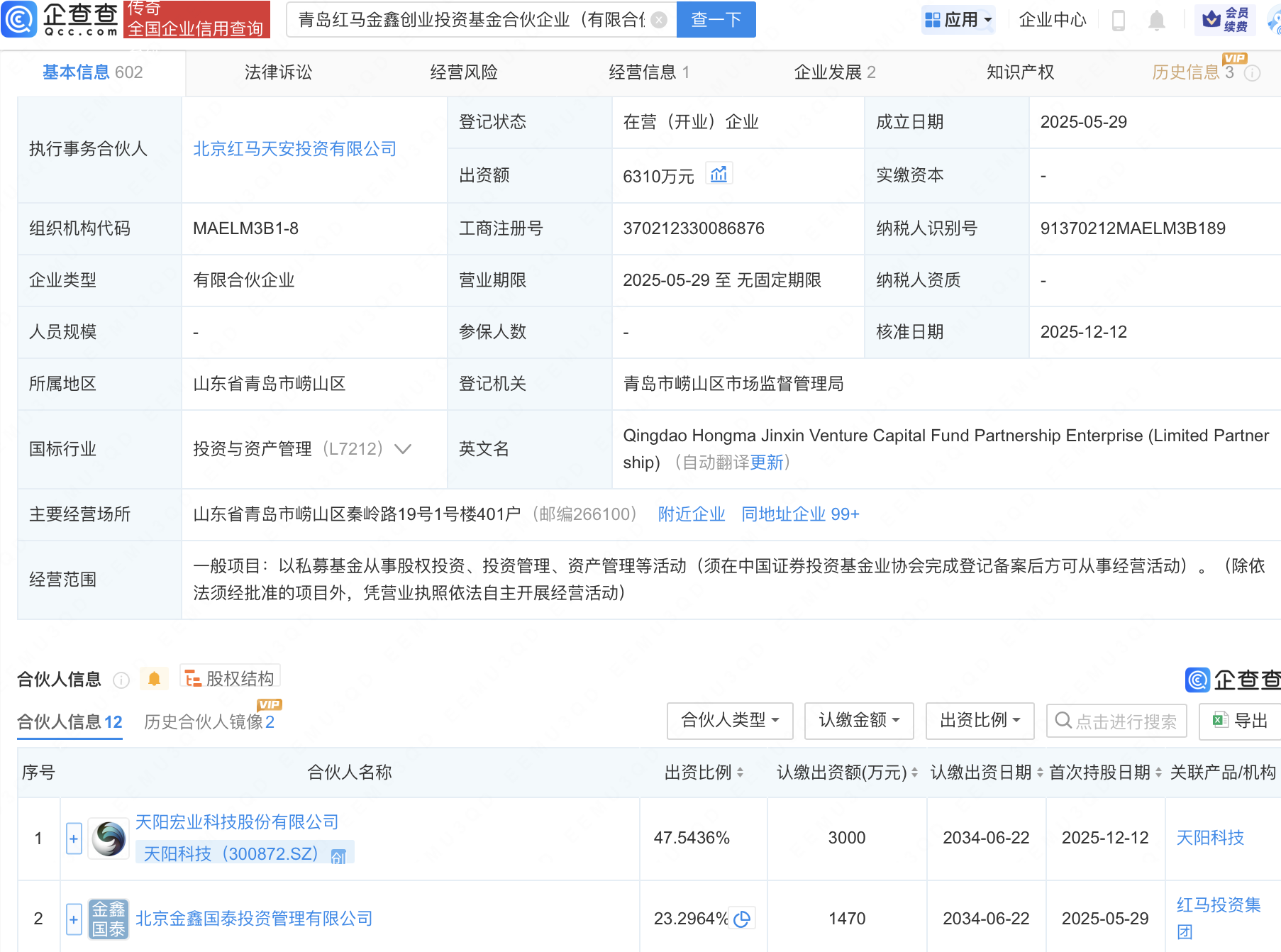 企查查APP显示,近日,青岛红马金鑫创业投资基金合伙企业(有限合伙)发生工商变更,新增天阳科技(300872)等为合伙人,持股47.54%成大股东,同时原股东北京金鑫国泰投资管理有限公司持股比例由99.5%下降至23.3%。企查查信息显示,该企业成立于2025年5月,经营范围包含:以私募基金从事股权投资、投资管理、资产管理等活动。