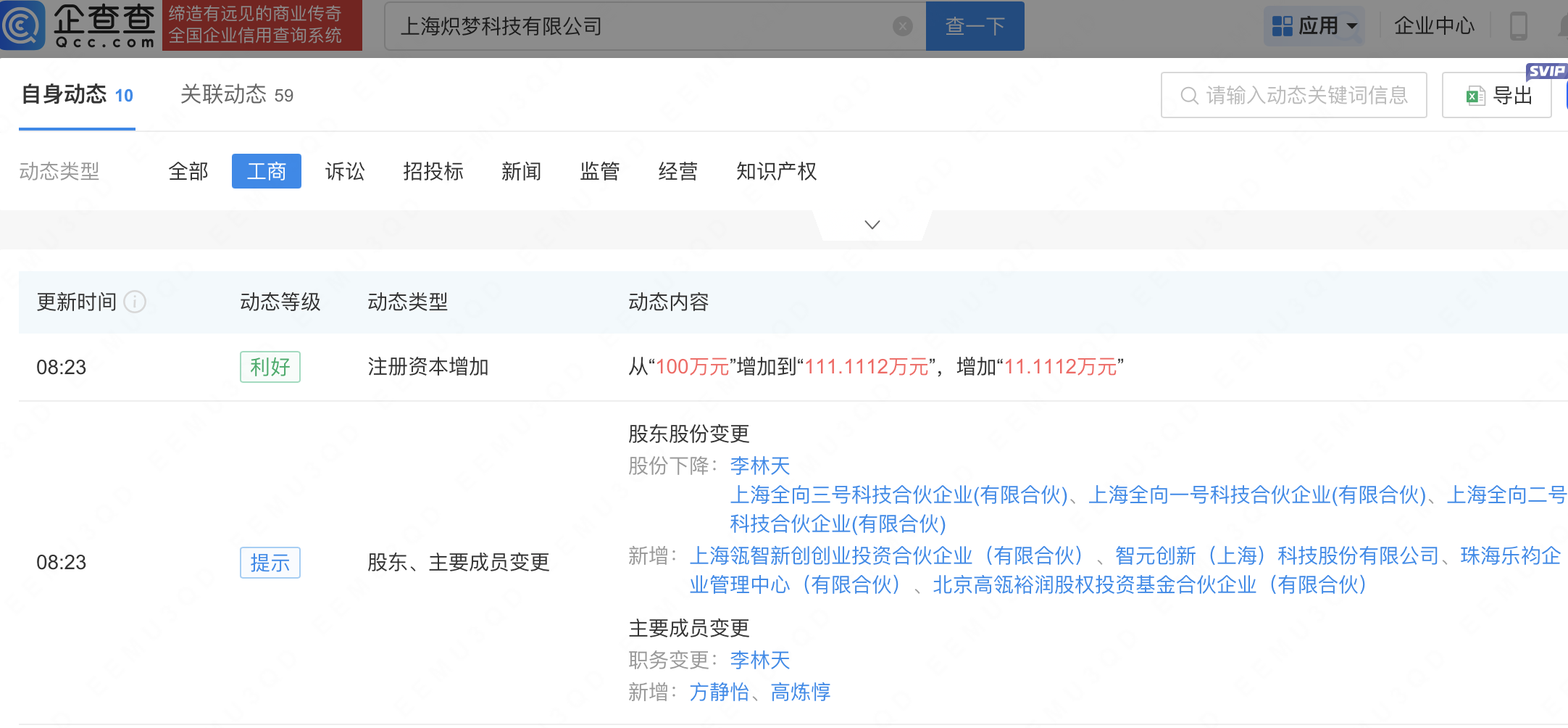 企查查APP显示,近日,上海炽梦科技有限公司发生工商变更,新增智元机器人关联公司智元创新(上海)科技股份有限公司、上海瓴智新创创业投资合伙企业(有限合伙)等为股东,同时注册资本增至约111.11万元。企查查信息显示,该公司成立于2025年9月,经营范围包含:智能机器人的研发;智能机器人销售;人工智能理论与算法软件开发;人工智能应用软件开发等。公开信息显示,炽梦科技专注于陪伴机器人研发。