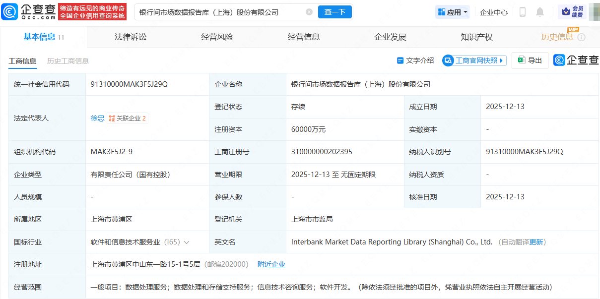 企查查APP显示,近日,银行间市场数据报告库(上海)股份有限公司成立,法定代表人为徐忠,注册资本6亿元,经营范围包含:数据处理服务;数据处理和存储支持服务;信息技术咨询服务;软件开发。企查查股权穿透显示,该公司由上海黄金交易所、上海票据交易所股份有限公司、银行间市场清算所股份有限公司等共同持股。
