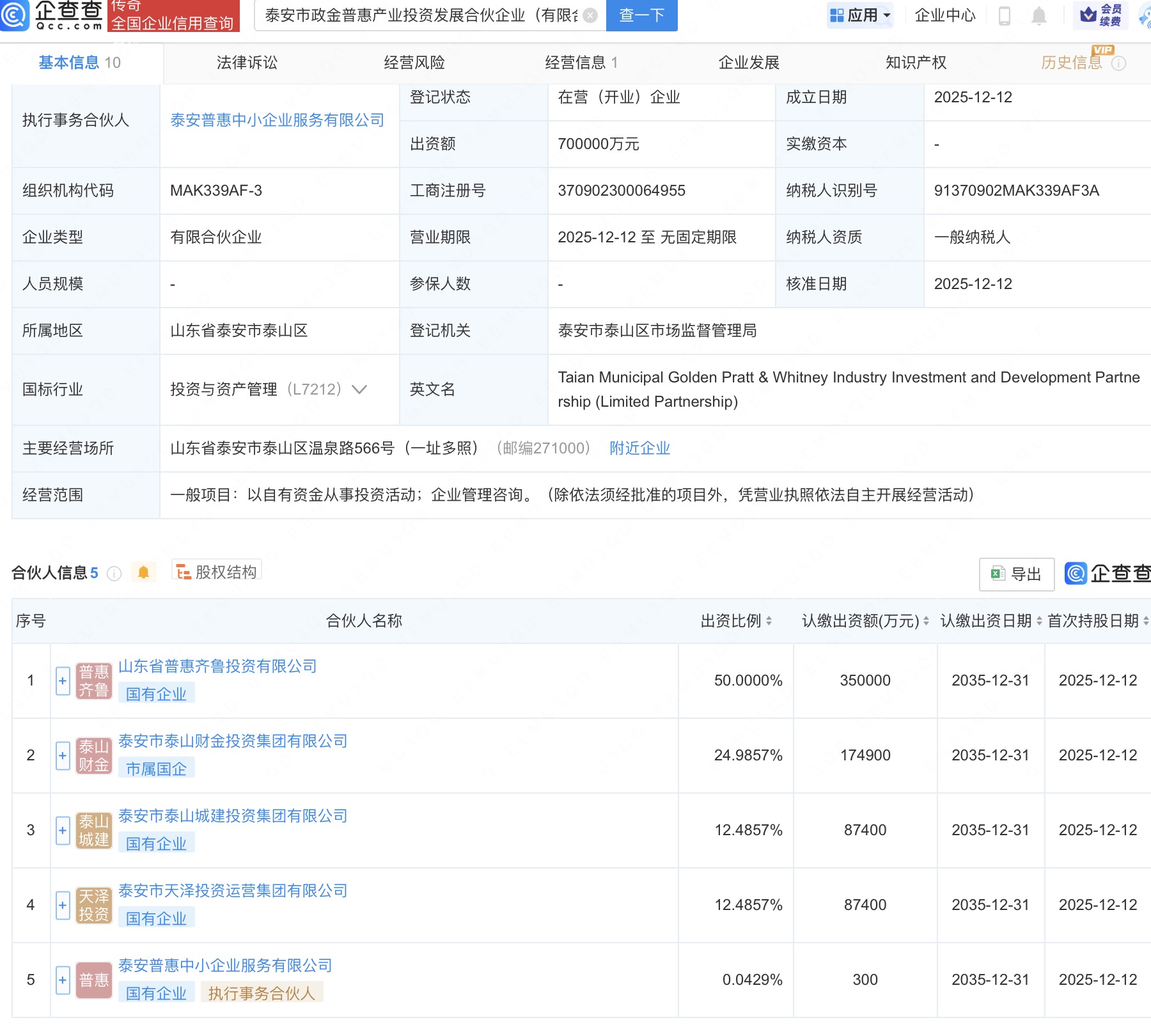 企查查APP显示,近日,泰安市政金普惠产业投资发展合伙企业(有限合伙)成立,出资额70亿元,经营范围包含:以自有资金从事投资活动;企业管理咨询。企查查股权穿透显示,该企业由山东省普惠齐鲁投资有限公司、泰安市泰山财金投资集团有限公司等共同出资。
