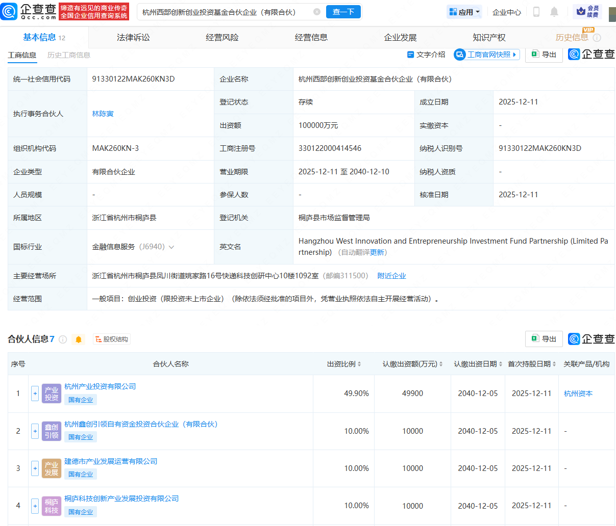企查查APP显示,近日,杭州西部创新创业投资基金合伙企业(有限合伙)成立,出资额10亿人民币,经营范围为创业投资。企查查股权穿透显示,该合伙企业由杭州产业投资有限公司、桐庐科技创新产业发展投资有限公司、杭州资向未来企业管理有限公司等共同出资。