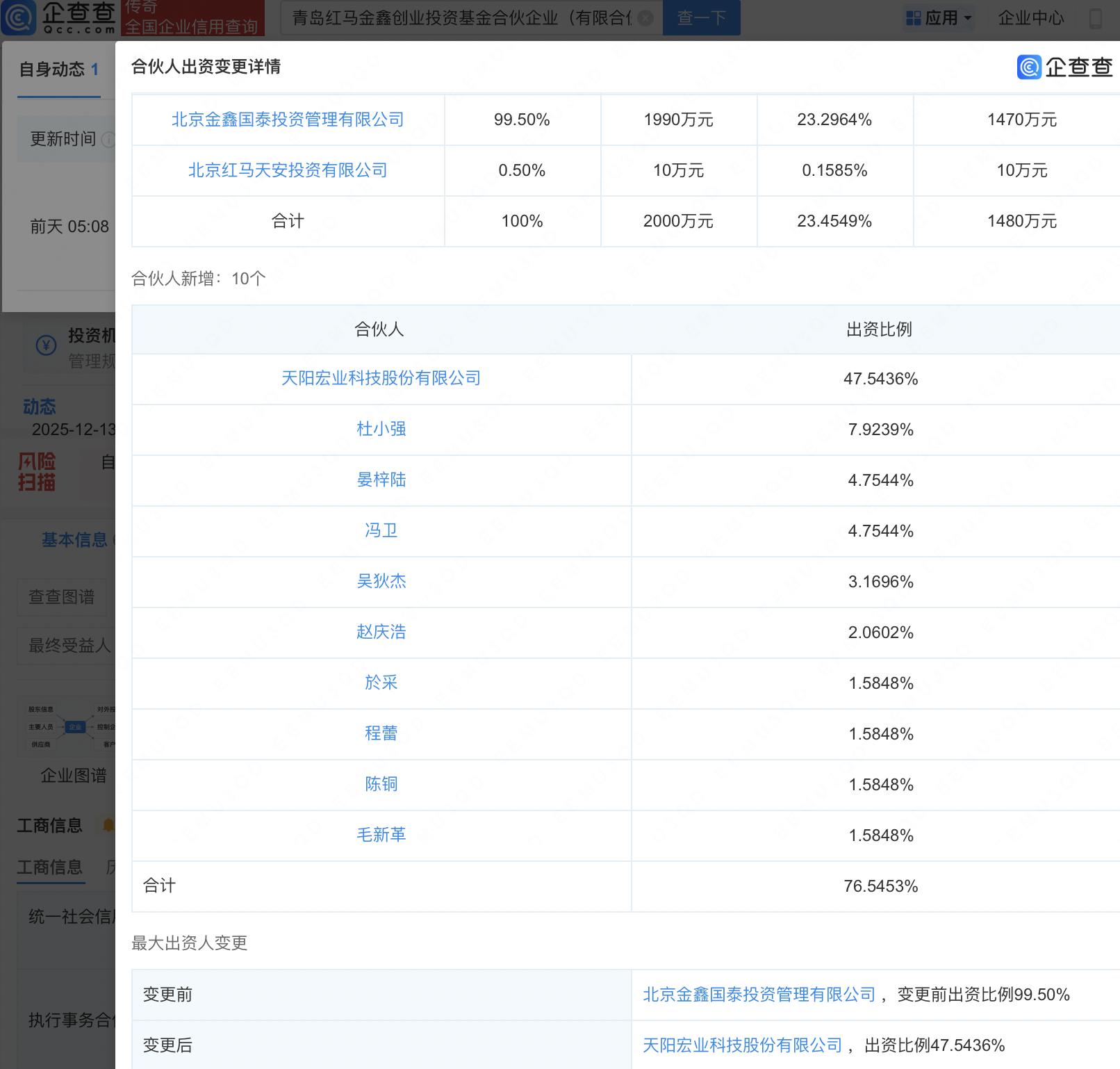 企查查APP显示,近日,青岛红马金鑫创业投资基金合伙企业(有限合伙)发生工商变更,新增天阳科技(300872)等为合伙人,持股47.54%成大股东,同时原股东北京金鑫国泰投资管理有限公司持股比例由99.5%下降至23.3%。企查查信息显示,该企业成立于2025年5月,经营范围包含:以私募基金从事股权投资、投资管理、资产管理等活动。