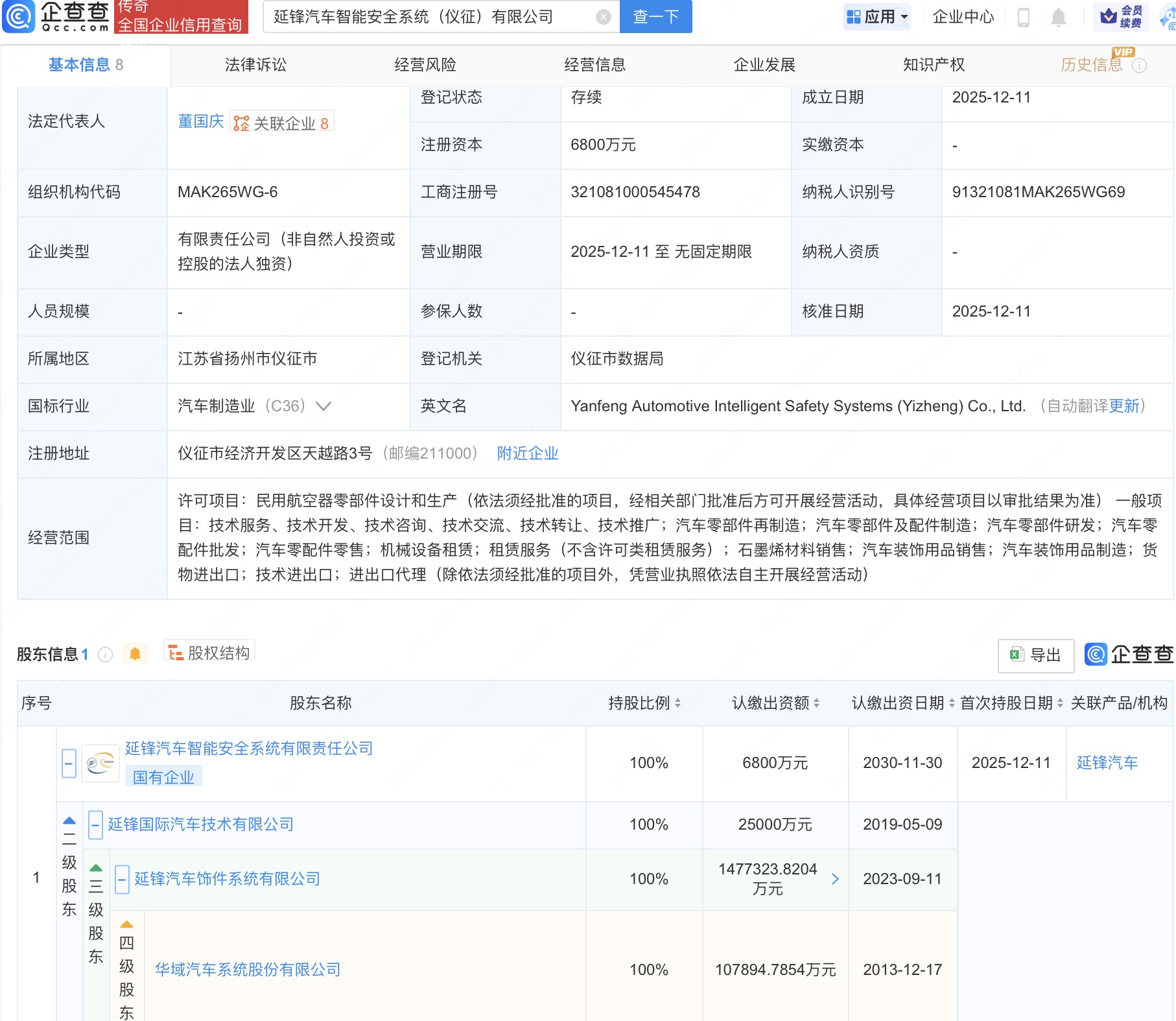 企查查APP显示,近日,延锋汽车智能安全系统(仪征)有限公司成立,法定代表人为董国庆,注册资本6800万人民币,经营范围包括民用航空器零部件设计和生产、汽车零部件及配件制造、石墨烯材料销售、汽车装饰用品销售等。企查查股权穿透显示,该公司由华域汽车(600741)间接全资持股。