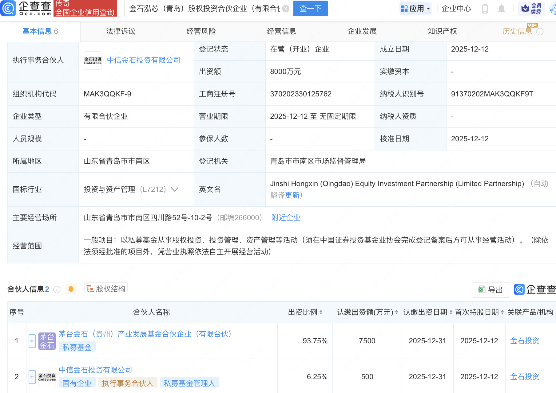 企查查APP显示,近日,金石泓芯(青岛)股权投资合伙企业(有限合伙)成立,出资额8000万元,经营范围包含:以私募基金从事股权投资、投资管理、资产管理等活动。企查查股权穿透显示,该企业由茅台金石(贵州)产业发展基金合伙企业(有限合伙)、中信金石投资有限公司共同出资。