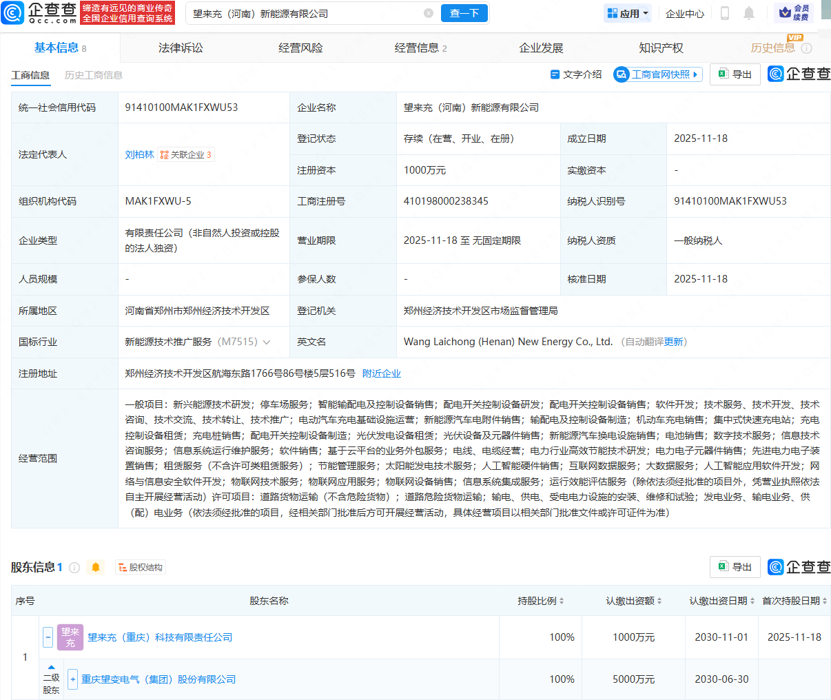 企查查APP显示,近日,望来充(河南)新能源有限公司成立,法定代表人为刘柏林,注册资本为1000万元,经营范围包含:新兴能源技术研发;机动车充电销售;集中式快速充电站;充电桩销售;电池销售等。企查查股权穿透显示,该公司由望变电气(603191)间接全资持股。