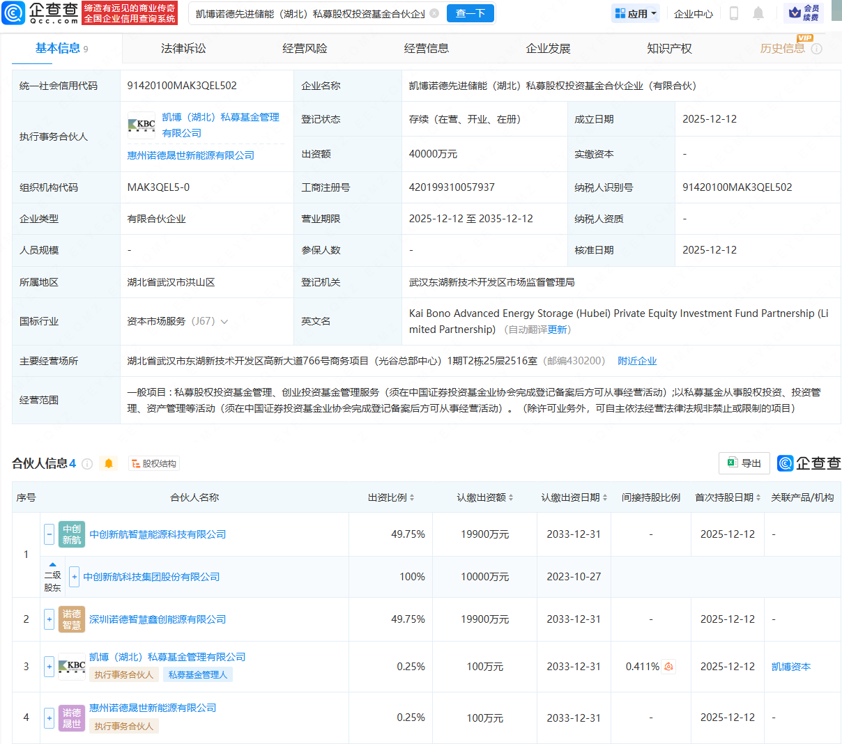 企查查APP显示,近日,凯博诺德先进储能(湖北)私募股权投资基金合伙企业(有限合伙)成立,出资额4亿元,经营范围包含:私募股权投资基金管理、创业投资基金管理服务;以私募基金从事股权投资、投资管理、资产管理等活动。企查查股权穿透显示,该合伙企业由中创新航(03931.HK)全资子公司中创新航智慧能源科技有限公司、凯博(湖北)私募基金管理有限公司等共同持股。