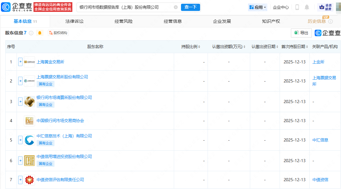 企查查APP显示,近日,银行间市场数据报告库(上海)股份有限公司成立,法定代表人为徐忠,注册资本6亿元,经营范围包含:数据处理服务;数据处理和存储支持服务;信息技术咨询服务;软件开发。企查查股权穿透显示,该公司由上海黄金交易所、上海票据交易所股份有限公司、银行间市场清算所股份有限公司等共同持股。