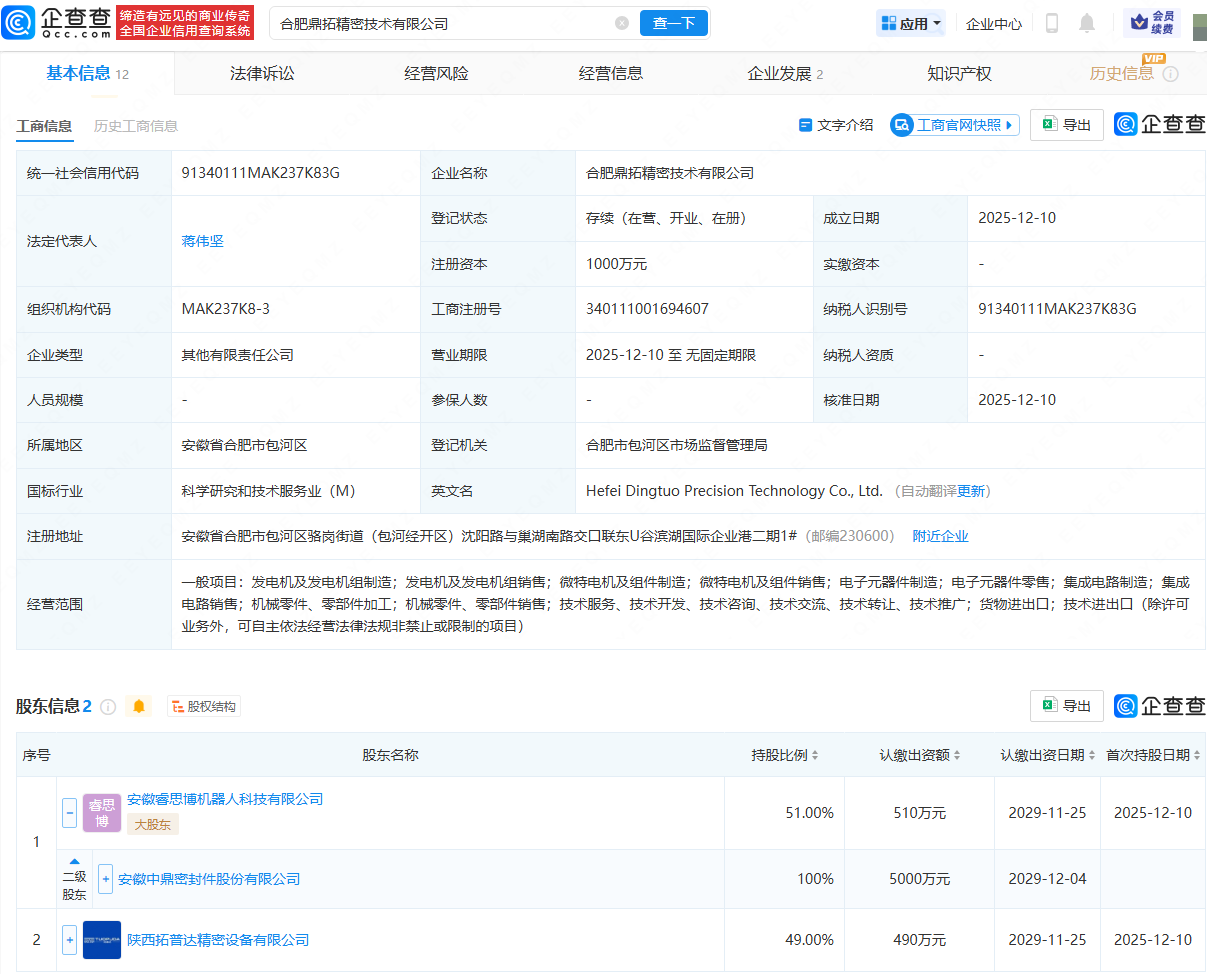 企查查APP显示,近日,合肥鼎拓精密技术有限公司成立,法定代表人为蒋伟坚,注册资本为1000万元,经营范围包含:发电机及发电机组制造;微特电机及组件销售;电子元器件制造;集成电路制造;集成电路销售等。企查查股权穿透显示,该公司由中鼎股份(000887)全资子公司安徽睿思博机器人科技有限公司、陕西拓普达精密设备有限公司共同持股。