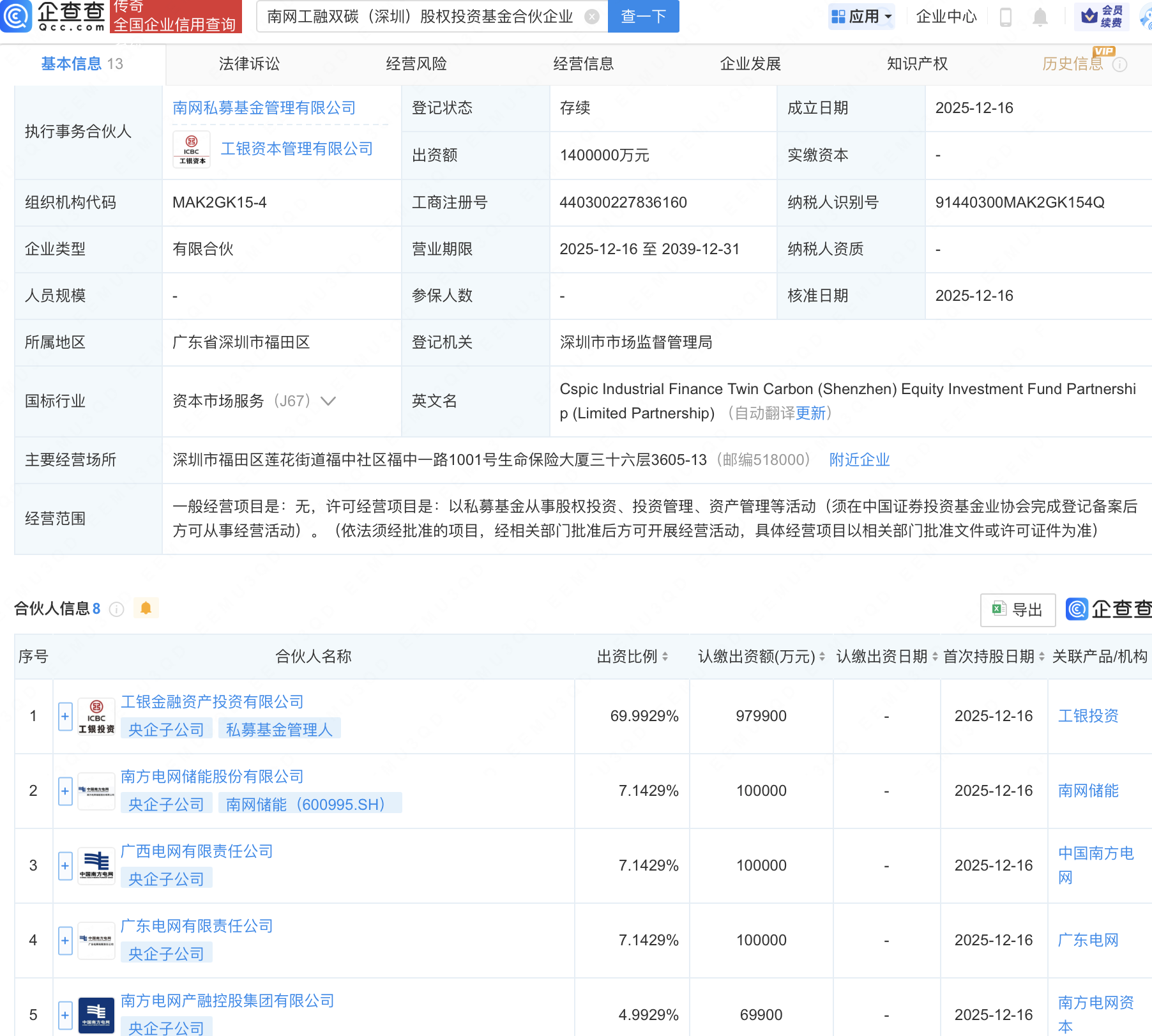 企查查APP显示,近日,南网工融双碳(深圳)股权投资基金合伙企业(有限合伙)成立,出资额140亿元,经营范围包含:以私募基金从事股权投资、投资管理、资产管理等活动。企查查股权穿透显示,该企业由工银金融资产投资有限公司、南网储能(600995)等共同出资。