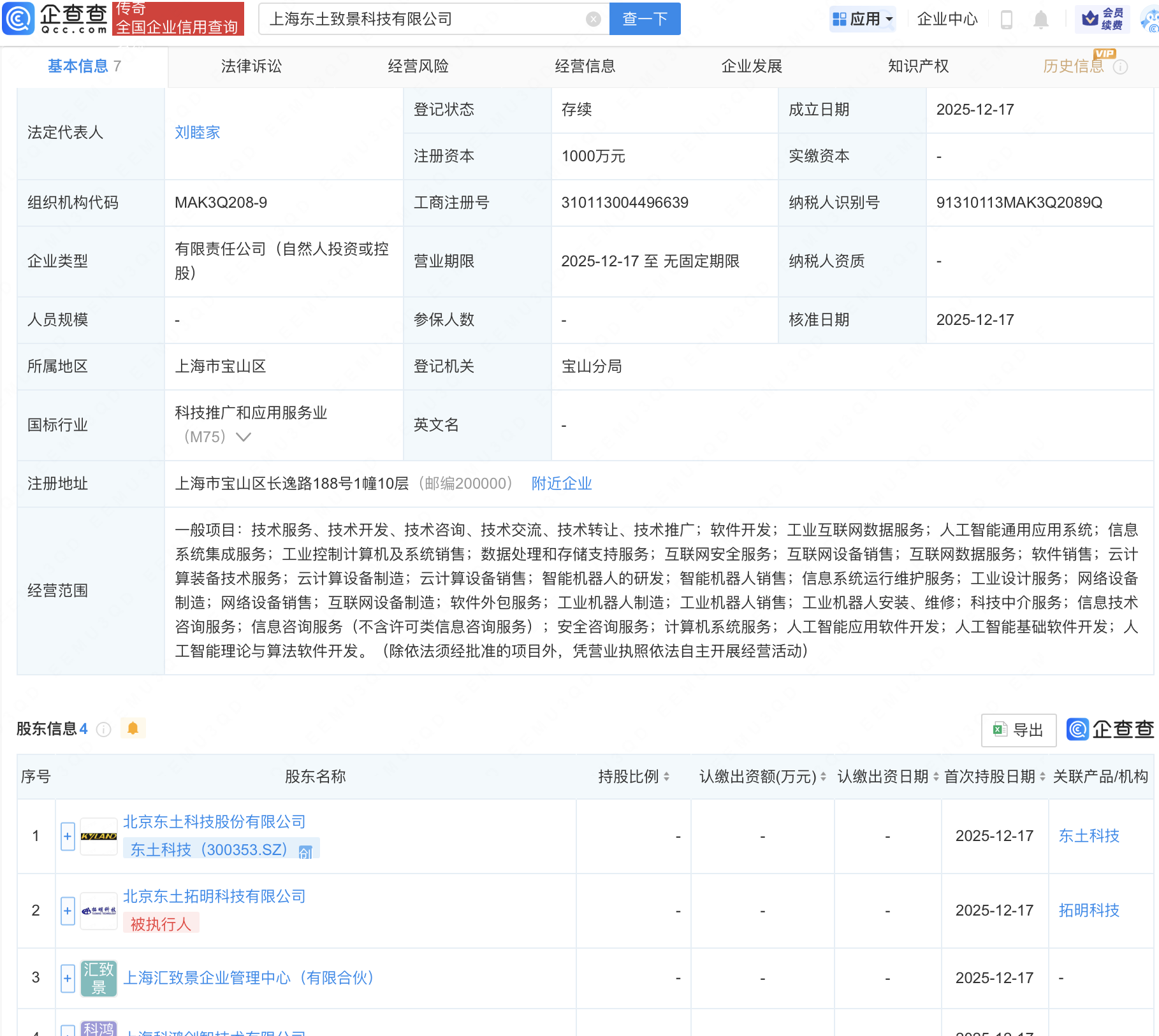 企查查APP显示,近日,上海东土致景科技有限公司成立,注册资本1000万元,经营范围包含:智能机器人的研发;智能机器人销售;人工智能应用软件开发;人工智能基础软件开发;人工智能理论与算法软件开发等。企查查股权穿透显示,该公司由东土科技(300353)等共同持股。