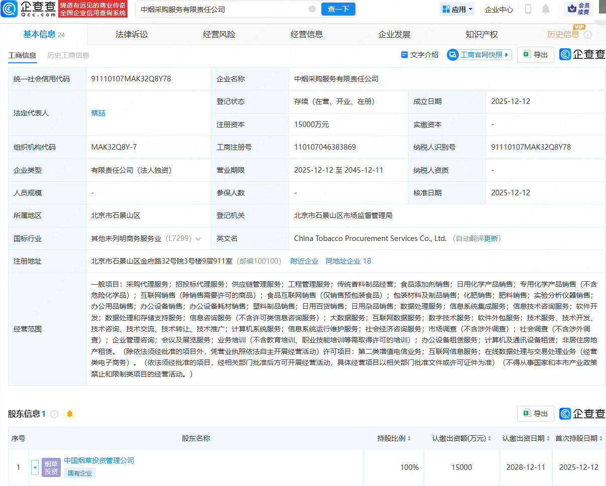 企查查APP显示,近日,中烟采购服务有限责任公司成立,法定代表人为蔡喆,注册资本为1.5亿元,经营范围包含:采购代理服务;招投标代理服务;供应链管理服务;工程管理服务;传统香料制品经营等。企查查股权穿透显示,该公司由中国烟草投资管理公司全资持股。 ​
