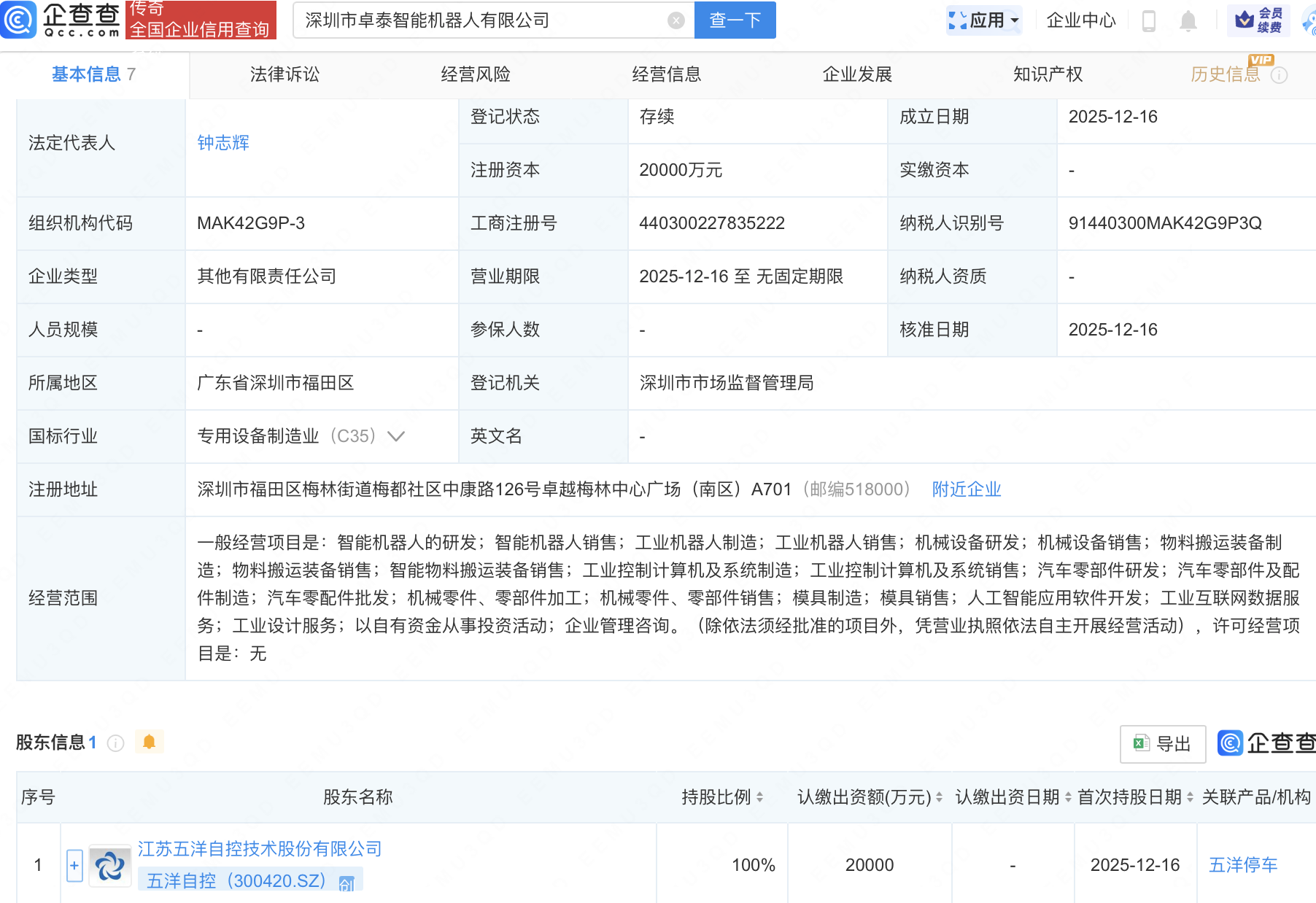 企查查APP显示,近日,深圳市卓泰智能机器人有限公司成立,注册资本2亿元,经营范围包含:智能机器人的研发;智能机器人销售;人工智能应用软件开发;工业互联网数据服务等。企查查股权穿透显示,该公司由五洋自控(300420)全资持股。