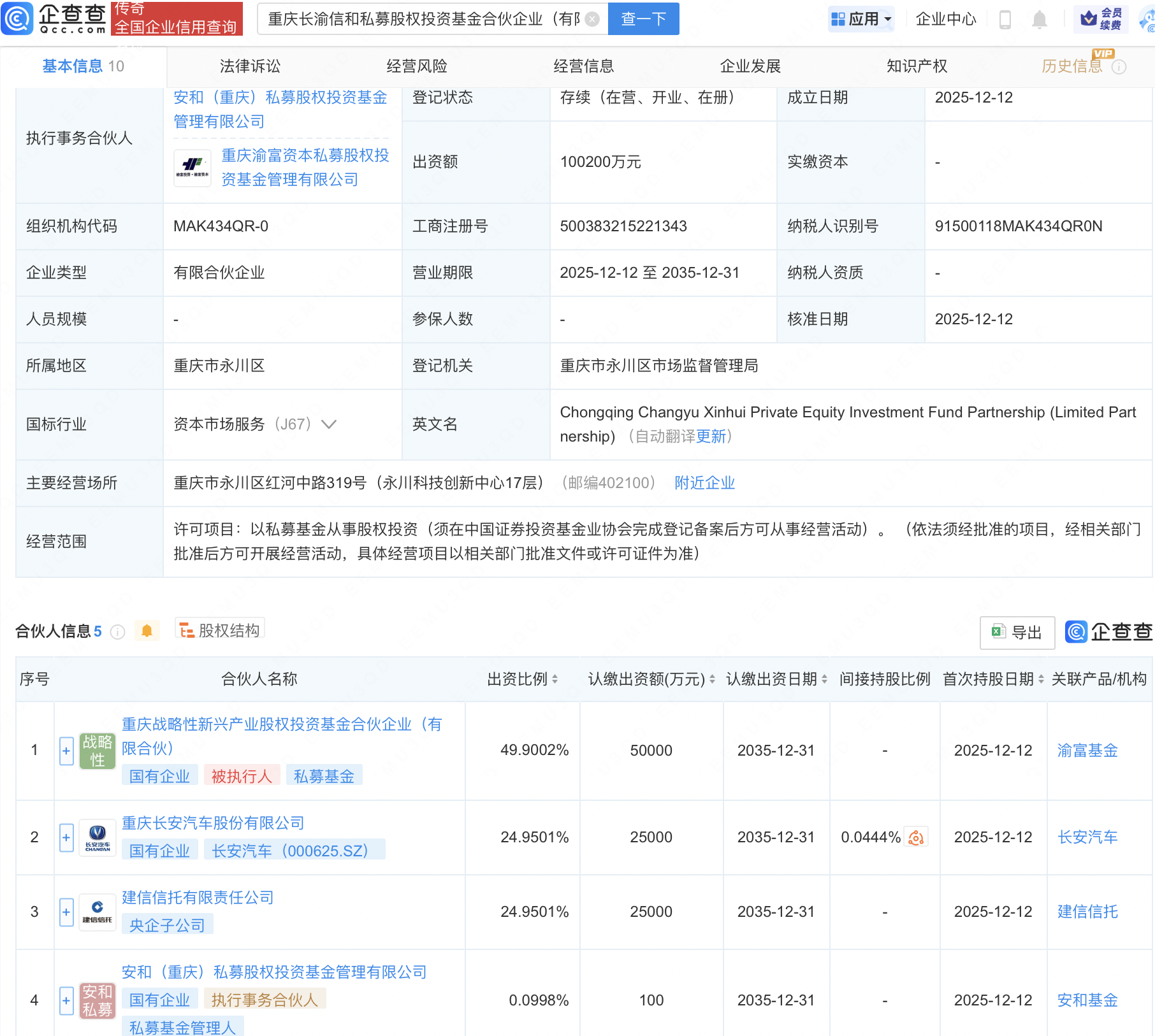 企查查APP显示,近日,重庆长渝信和私募股权投资基金合伙企业(有限合伙)成立,出资额10.02亿元,经营范围包含:以私募基金从事股权投资。企查查股权穿透显示,该企业由长安汽车(000625)、建信信托有限责任公司等共同出资。