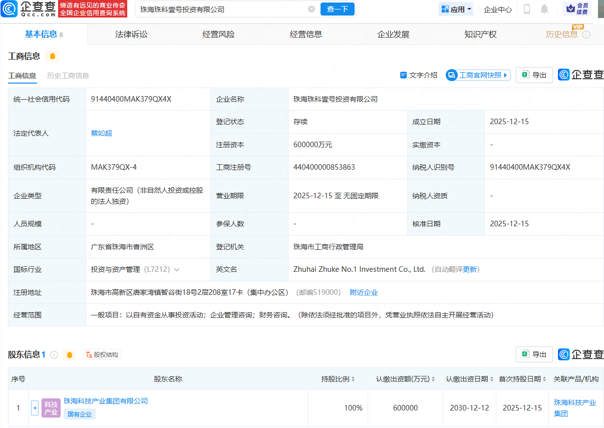 企查查APP显示,近日,珠海珠科壹号投资有限公司成立,法定代表人为蔡如超,注册资本60亿元,经营范围包含:以自有资金从事投资活动;企业管理咨询;财务咨询。企查查股权穿透显示,该公司由珠海科技产业集团有限公司全资持股。