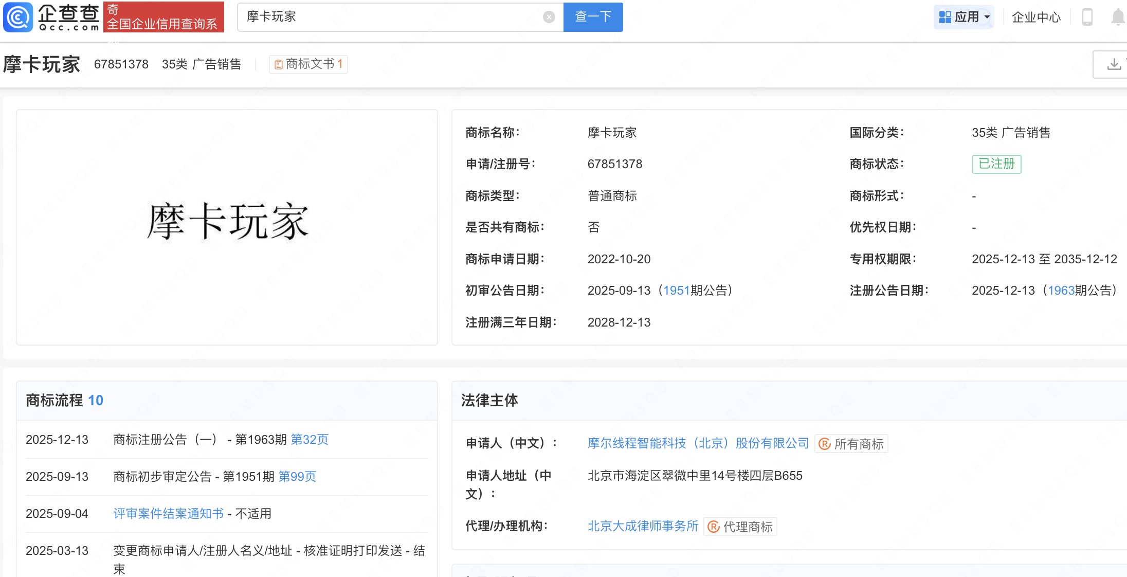 企查查APP显示,近日,摩尔线程(688795)成功注册1枚“摩卡玩家”商标,国际分类为广告销售。公开信息显示,摩卡玩家是摩尔线程显卡用户的一个社交平台,专注于分享产品体验和游戏乐趣。