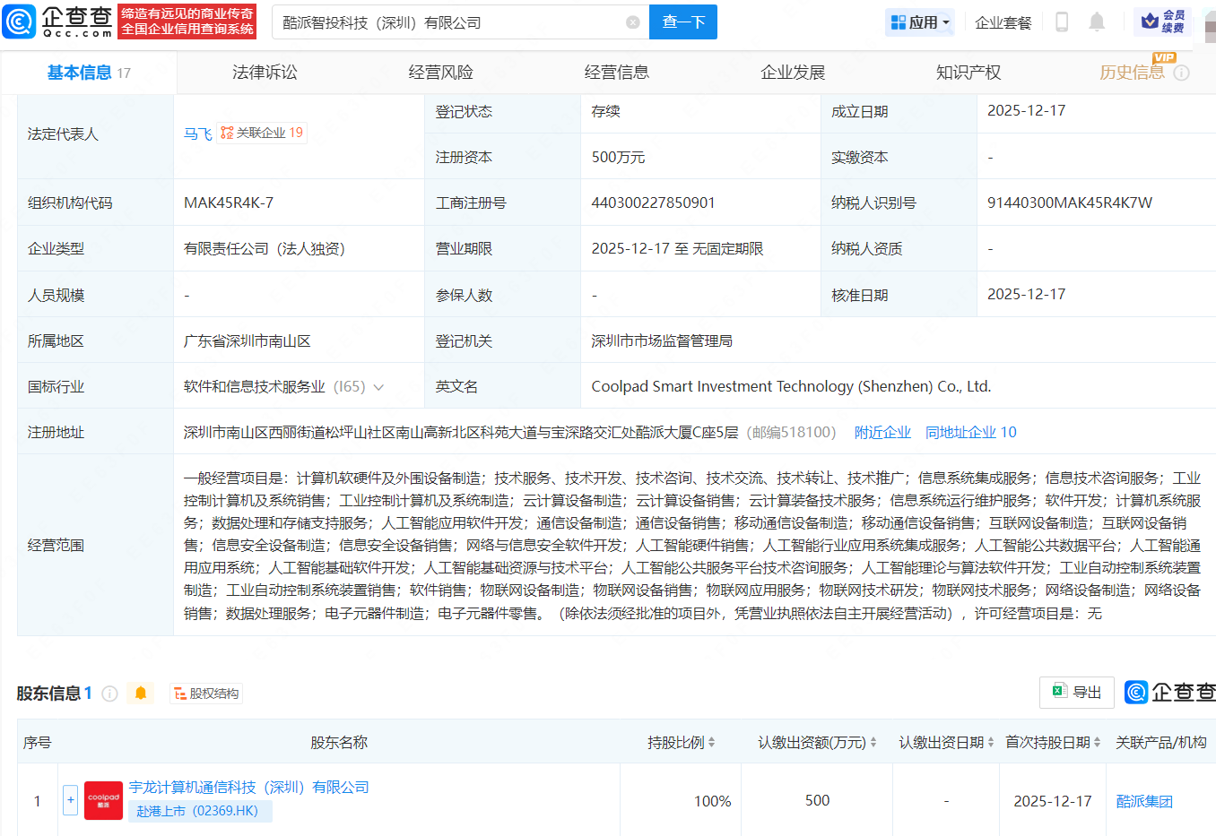 企查查APP显示,近日,酷派智投科技(深圳)有限公司成立,法定代表人为马飞,注册资本500万元,经营范围包含计算机软硬件及外围设备制造、人工智能应用软件开发、人工智能硬件销售等。企查查股权穿透显示,该公司由酷派集团关联的宇龙计算机通信科技(深圳)有限公司全资持股。
