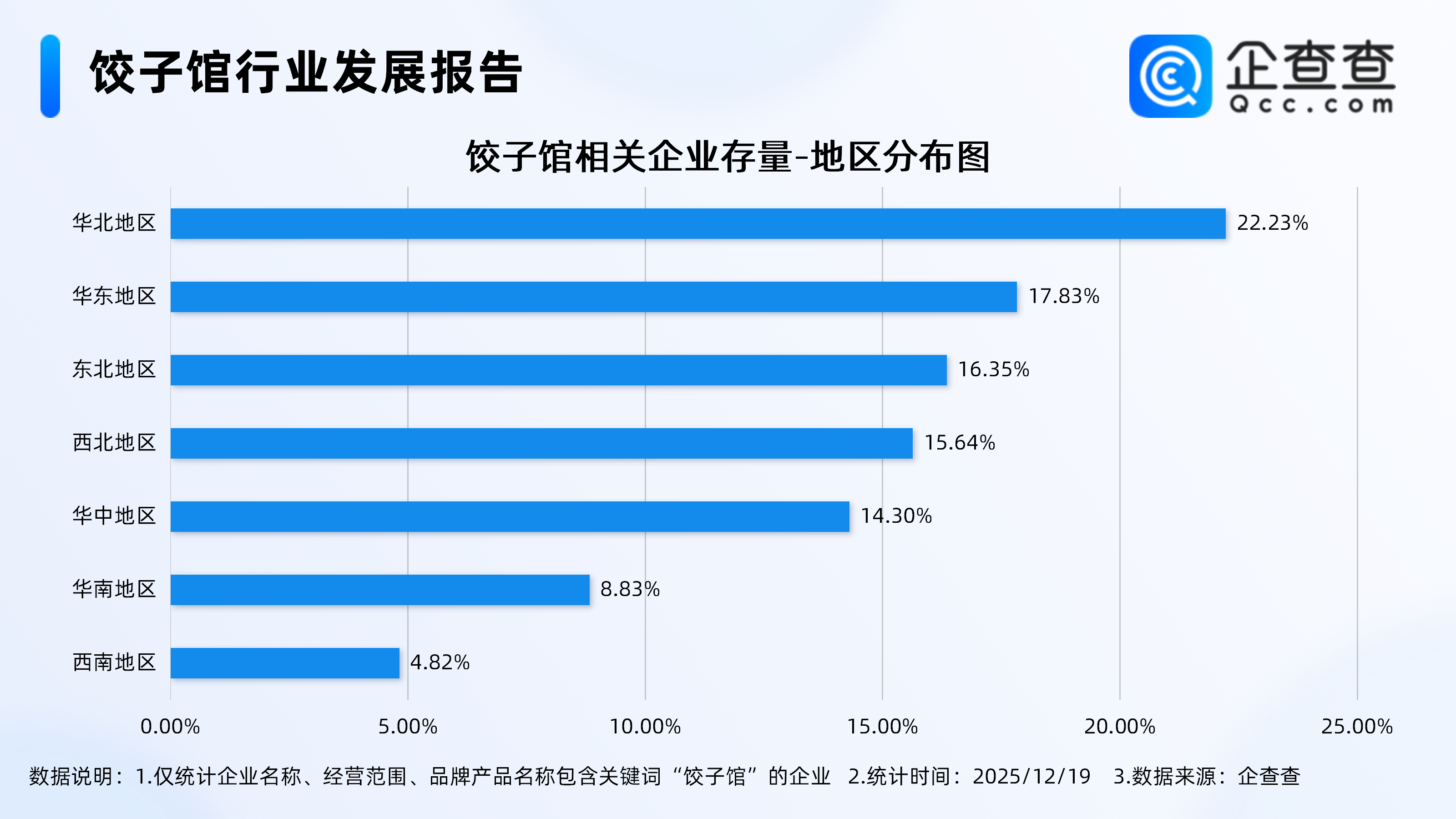 企查查数据显示,截至12月19日,国内现存饺子馆相关企业5.71万家。从经营时间来看,现存饺子馆相关企业多为老牌企业,成立年限在5-10年的相关企业最多,占比39.24%,在10年以上的相关企业占比23.93%。从地区分布来看,分布在华北地区的饺子馆相关企业最多,占比22.23%。注册量方面,2024年全年注册6173家相关企业,截至目前,今年已注册5252家。