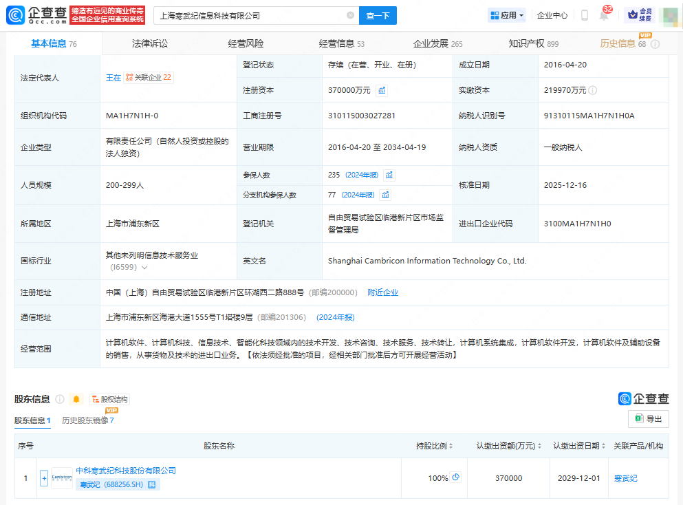 企查查APP显示,近日,上海寒武纪信息科技有限公司发生工商变更,注册资本由27亿人民币增至37亿人民币。企查查信息显示,该公司成立于2016年4月,法定代表人为王在,经营范围涉及计算机软件、计算机科技、信息技术、智能化科技领域内的技术开发、技术咨询、技术服务、技术转让等,由寒武纪(688256)全资持股。