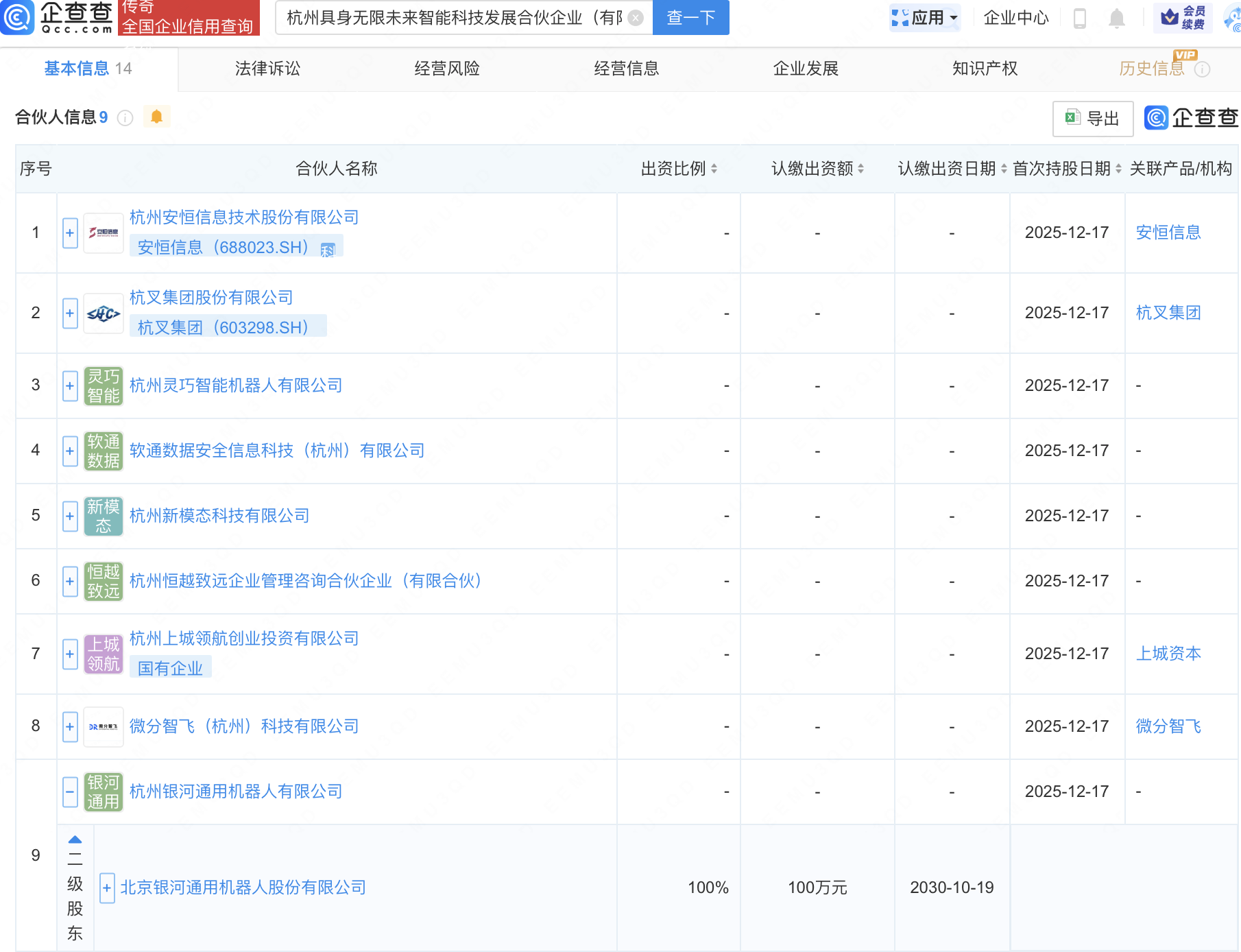 企查查APP显示,近日,杭州具身无限未来智能科技发展合伙企业(有限合伙)成立,经营范围包含:信息技术咨询服务;以自有资金从事投资活动等。企查查股权穿透显示,该企业由安恒信息(688023)、杭叉集团(603298)、北京银河通用机器人股份有限公司全资子公司杭州银河通用机器人有限公司等共同出资。