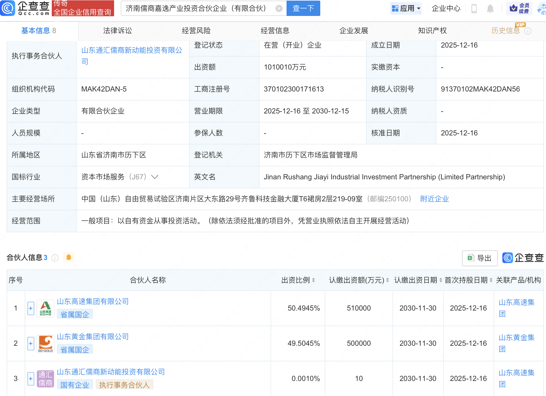 企查查APP显示,近日,济南儒商嘉逸产业投资合伙企业(有限合伙)成立,出资额约101亿元,经营范围包含:以自有资金从事投资活动。企查查股权穿透显示,该企业由山东高速集团有限公司、山东黄金集团有限公司、山东通汇儒商新动能投资有限公司共同出资。