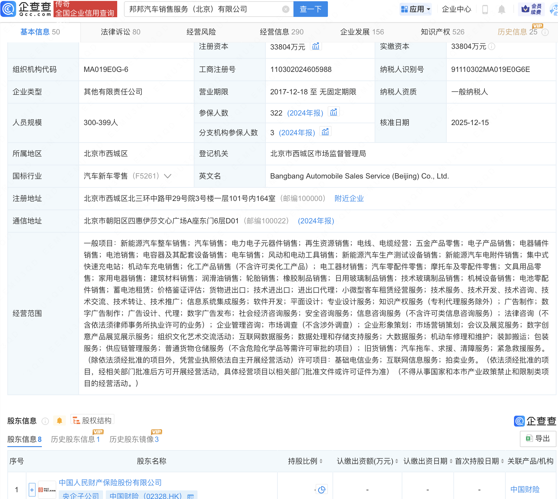 企查查APP显示,近日,邦邦汽服关联公司邦邦汽车销售服务(北京)有限公司发生工商变更,新增圆通速递(600233)、瓜子二手车关联公司车好多旧机动车经纪(北京)有限公司等为股东。企查查信息显示,该公司成立于2017年,经营范围包含:新能源汽车整车销售;汽车销售;电力电子元器件销售;再生资源销售等,现由中国财险(02328.HK)等及上述新增股东共同持股。公开信息显示,邦邦汽服是一家车后产业互联网平台企业。