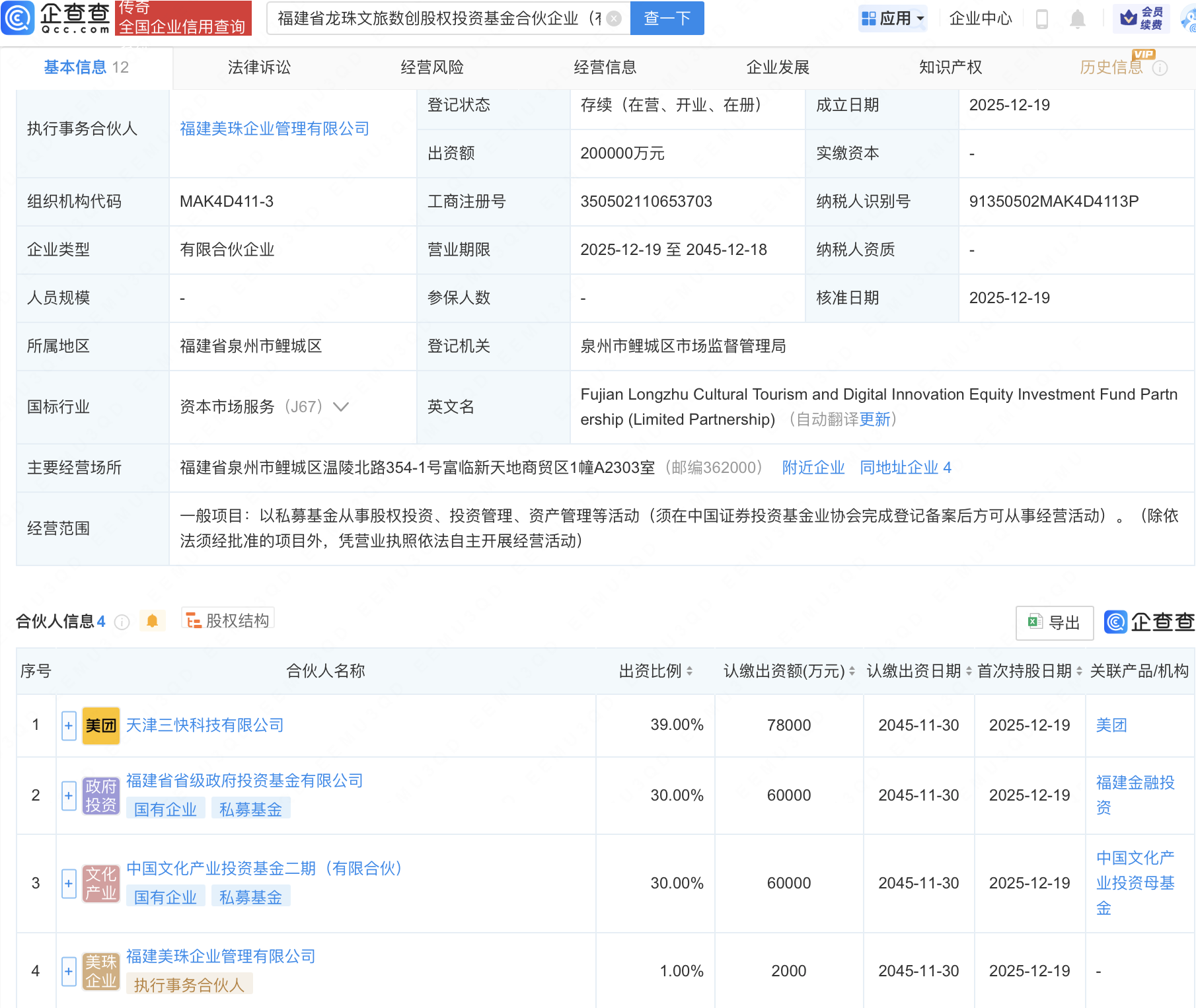企查查APP显示,近日,福建省龙珠文旅数创股权投资基金合伙企业(有限合伙)成立,出资额20亿元,经营范围包含:以私募基金从事股权投资、投资管理、资产管理等活动。企查查股权穿透显示,该企业由美团关联公司天津三快科技有限公司、福建美珠企业管理有限公司、中国文化产业投资基金二期(有限合伙)、福建省省级政府投资基金有限公司共同出资。