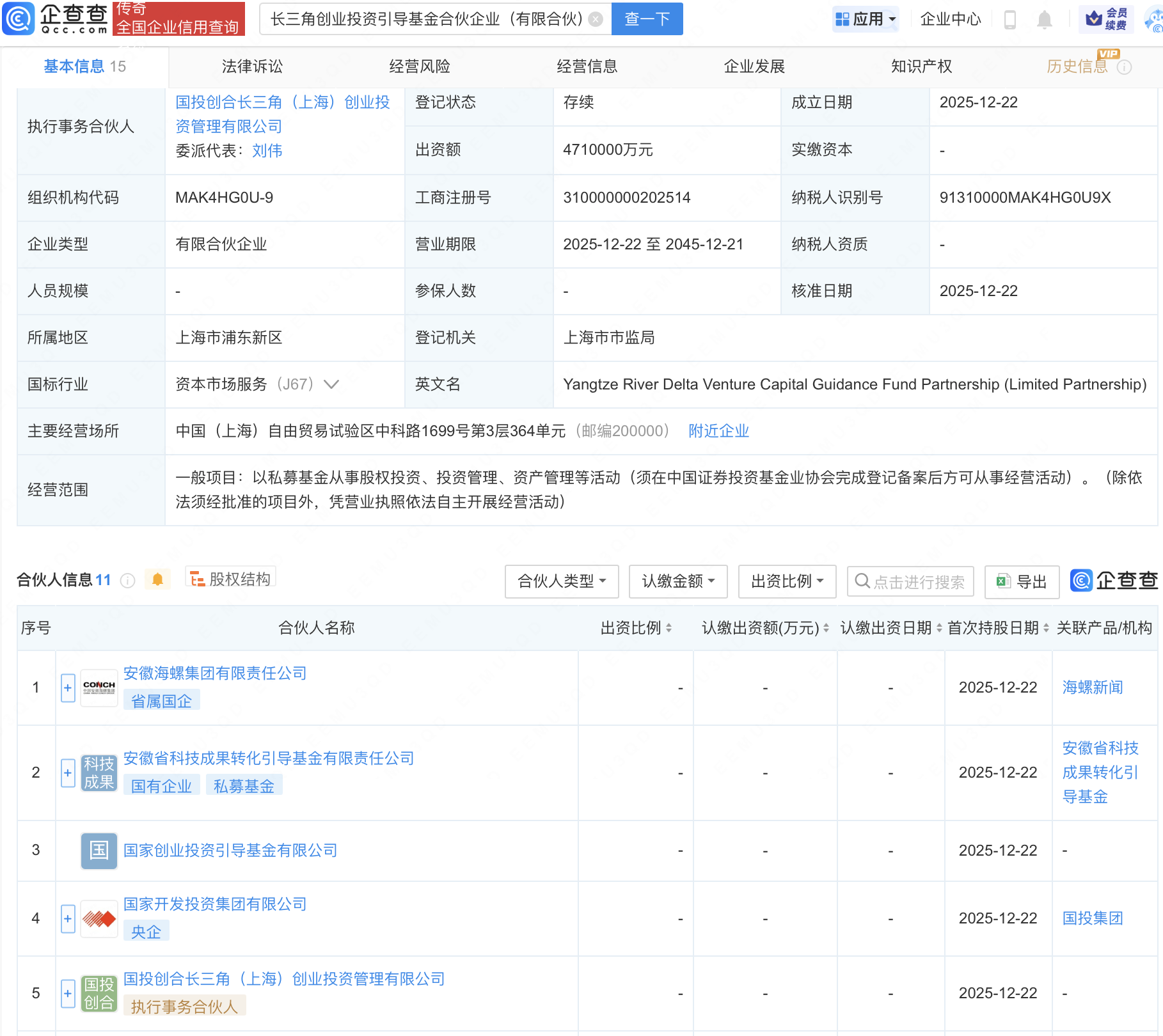 企查查APP显示,近日,长三角创业投资引导基金合伙企业(有限合伙)成立,出资额471亿元,经营范围包含:以私募基金从事股权投资、投资管理、资产管理等活动。企查查股权穿透显示,该企业由安徽海螺集团有限责任公司、安徽省科技成果转化引导基金有限责任公司、国家开发投资集团有限公司等共同出资。