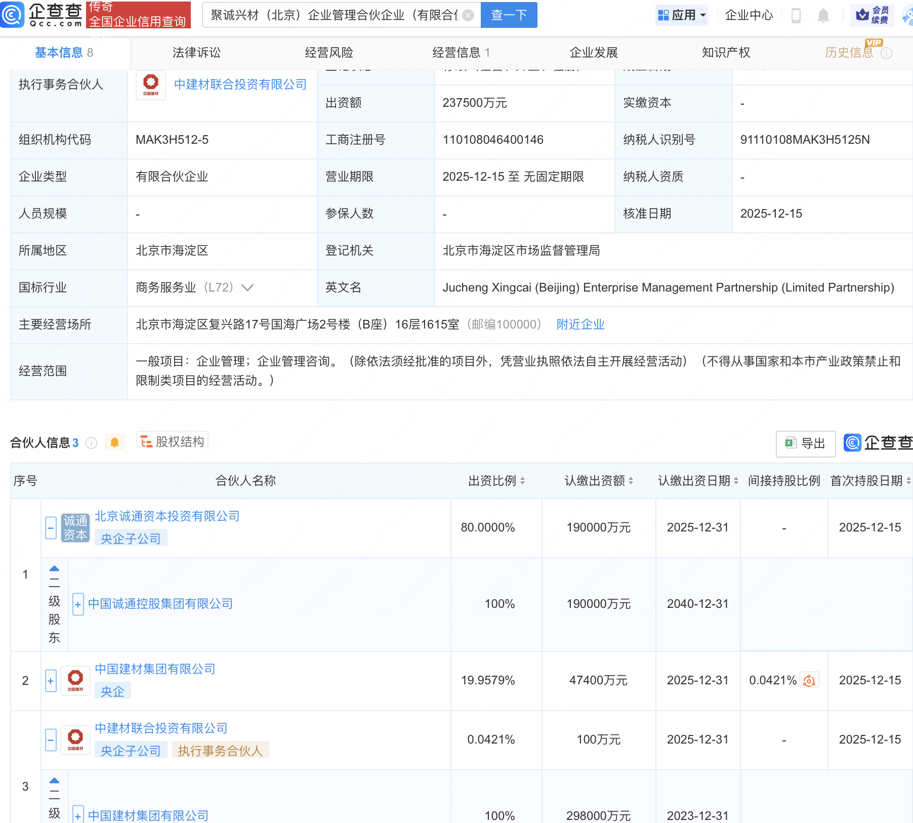 企查查APP显示,近日,聚诚兴材(北京)企业管理合伙企业(有限合伙)成立,出资额23.75亿元,经营范围包含:企业管理;企业管理咨询。企查查股权穿透显示,该企业由中国诚通控股集团有限公司、中国建材集团有限公司间接共同持股。