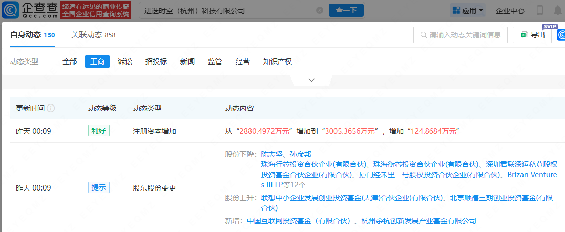 企查查APP显示,近日,进迭时空(杭州)科技有限公司发生工商变更,注册资本增加至约3005.37万元,新增中国互联网投资基金(有限合伙)、杭州余杭创新发展产业基金有限公司为股东。