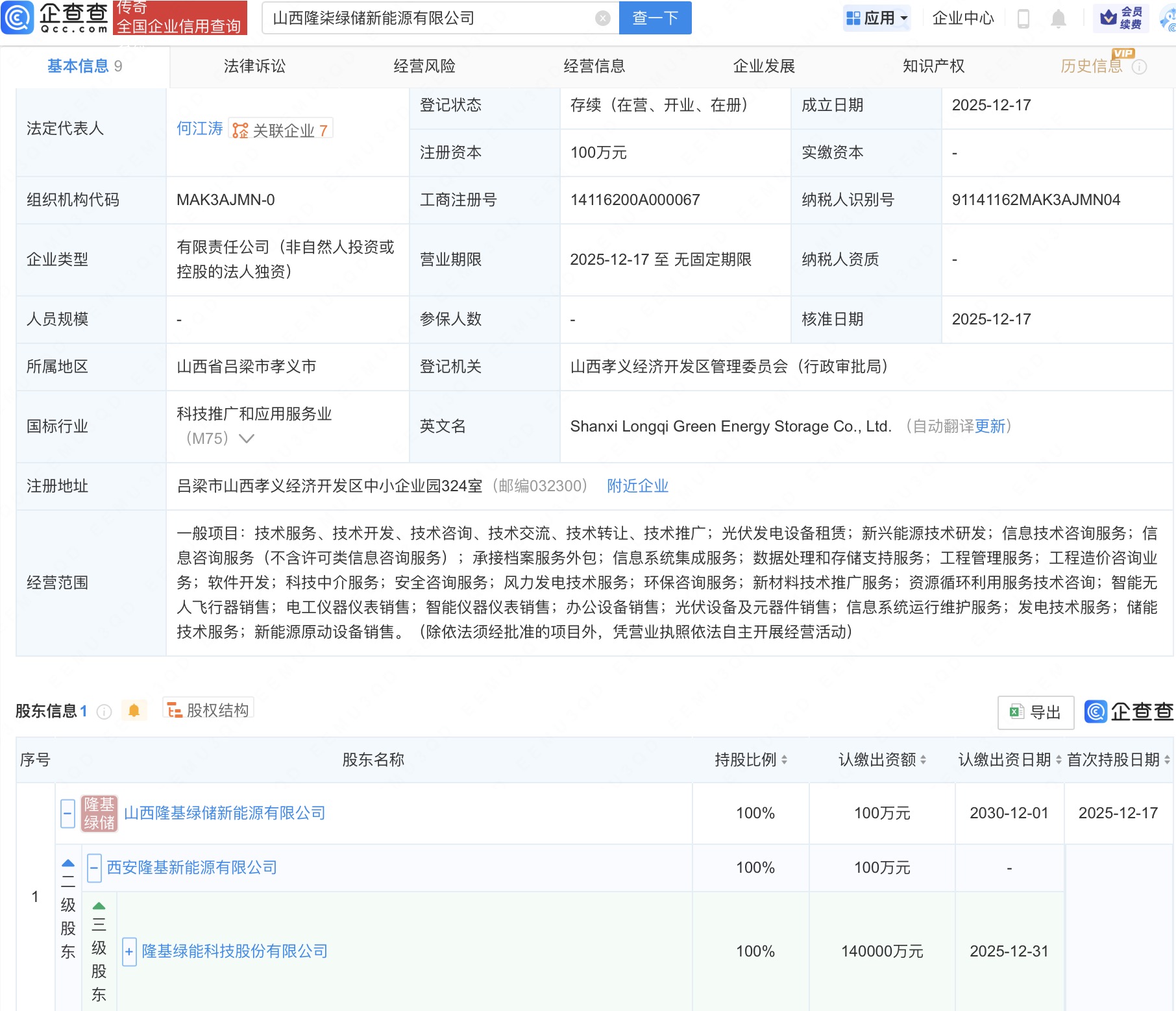 企查查APP显示,近日,山西隆柒绿储新能源有限公司成立,法定代表人为何江涛,经营范围含光伏发电设备租赁、新兴能源技术研发、信息技术咨询服务、信息咨询服务等。企查查股权穿透显示,该公司由隆基绿能(601012)间接全资持股。