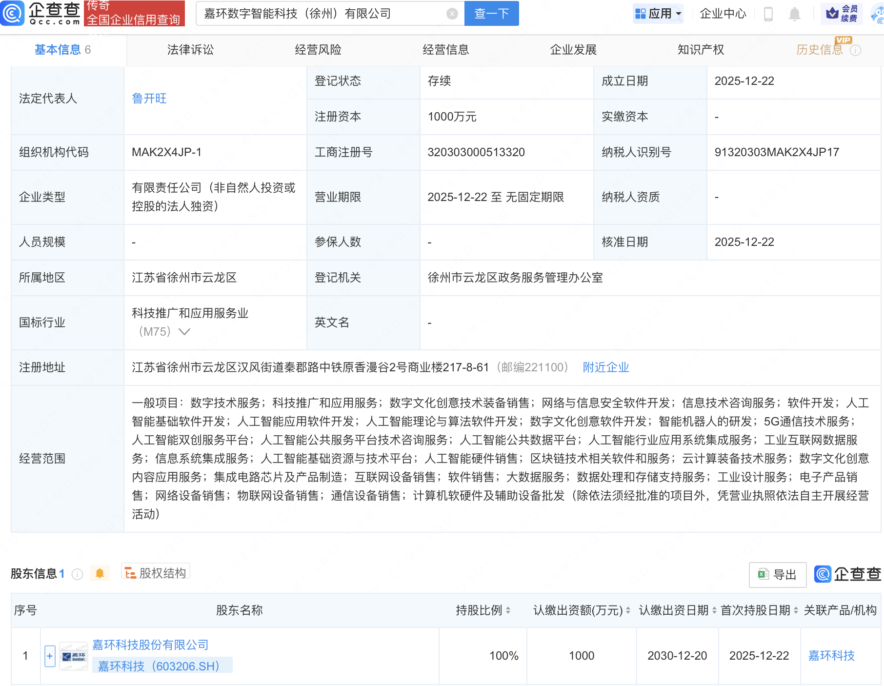 企查查APP显示,近日,嘉环数字智能科技(徐州)有限公司成立,注册资本1000万元,经营范围包含:人工智能应用软件开发;人工智能理论与算法软件开发;数字文化创意软件开发;智能机器人的研发等。企查查股权穿透显示,该公司由嘉环科技(603206)全资持股。
