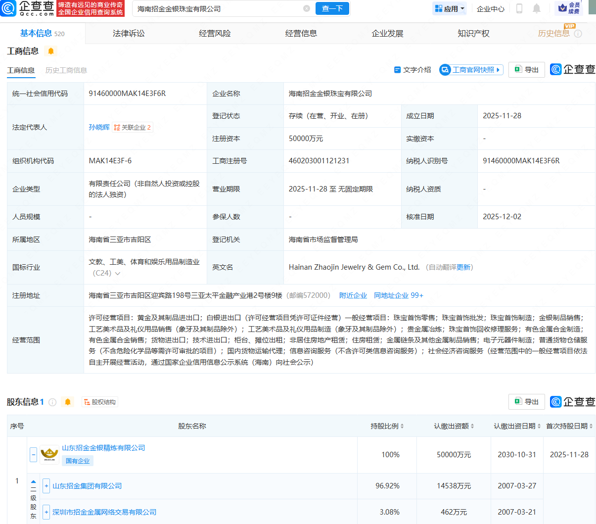 企查查APP显示,近日,海南招金金银珠宝有限公司成立,法定代表人为孙晓辉,注册资本为5亿元,经营范围包含:黄金及其制品进出口;白银进出口;珠宝首饰零售;珠宝首饰批发;珠宝首饰制造;金银制品销售等。企查查股权穿透显示,该公司由山东招金集团有限公司旗下山东招金金银精炼有限公司全资持股。