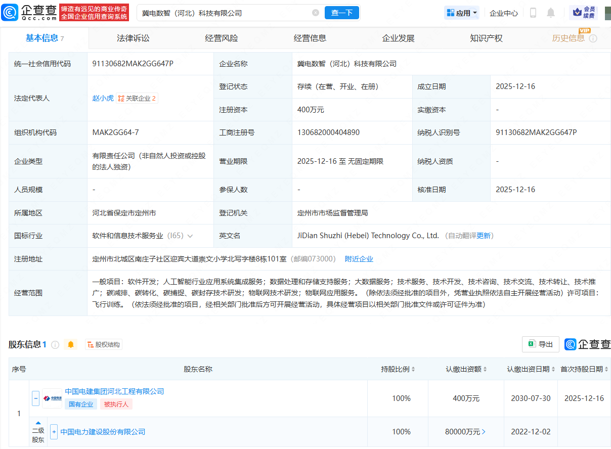 企查查APP显示,近日,冀电数智(河北)科技有限公司成立,法定代表人为赵小虎,经营范围包含:软件开发;人工智能行业应用系统集成服务;数据处理和存储支持服务;碳减排、碳转化、碳捕捉、碳封存技术研发等。企查查股权穿透显示,该公司由中国电建(601669)间接全资持股。
