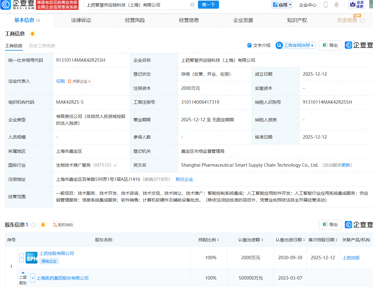 企查查APP显示,近日,上药智慧供应链科技(上海)有限公司成立,法定代表人为任刚,注册资本为2000万元,经营范围包含:智能控制系统集成;人工智能应用软件开发;人工智能行业应用系统集成服务;供应链管理服务等。企查查股权穿透显示,该公司由上海医药(601607)间接全资持股。