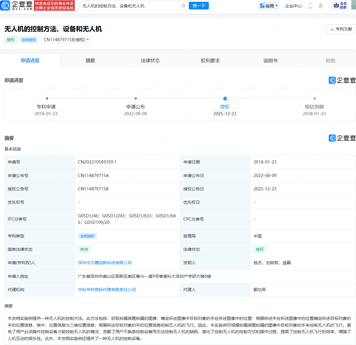 企查查APP显示,近日,深圳市大疆创新科技有限公司申请的“无人机的控制方法、设备和无人机”专利获授权。