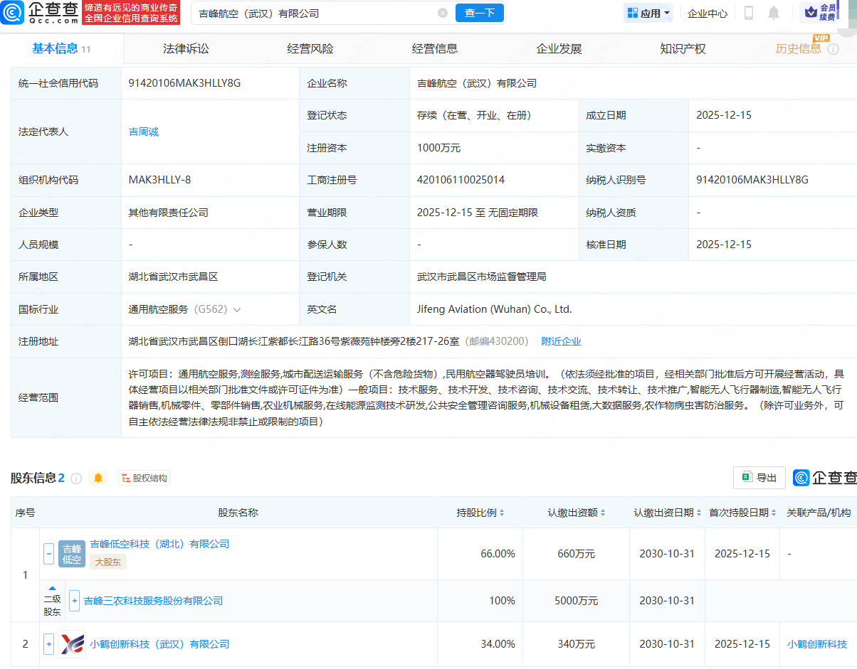 企查查APP显示,近日,吉峰航空(武汉)有限公司成立,法定代表人为吉周诚,注册资本为1000万元,经营范围包含:通用航空服务;测绘服务;民用航空器驾驶员培训;智能无人飞行器制造;智能无人飞行器销售等。企查查股权穿透显示,该公司由吉峰科技(300022)全资子公司吉峰低空科技(湖北)有限公司、小鹤创新科技(武汉)有限公司共同持股。