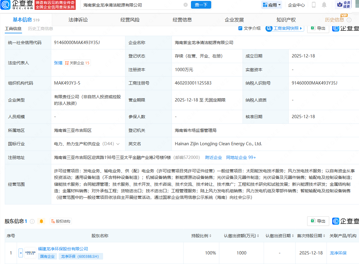 企查查APP显示,近日,海南紫金龙净清洁能源有限公司成立,法定代表人为张瑾,注册资本为1000万元,经营范围包含:发电业务、输电业务、供(配)电业务;太阳能发电技术服务;风力发电技术服务;新兴能源技术研发等。企查查股权穿透显示,该公司由龙净环保(600388)全资持股。
