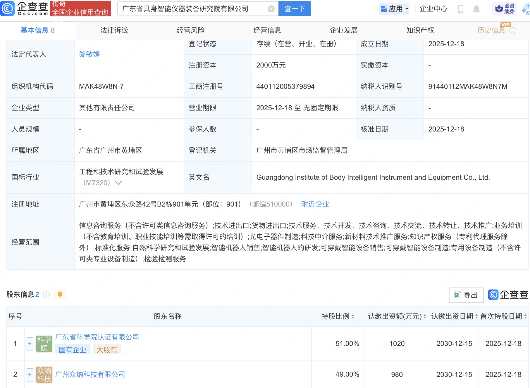 企查查APP显示,近日,广东省具身智能仪器装备研究院有限公司成立,法定代表人为黎敏婷,注册资本2000万人民币,经营范围含自然科学研究和试验发展、智能机器人销售、智能机器人的研发、可穿戴智能设备销售等。企查查股权穿透显示,该公司由广东省科学院认证有限公司、广州众纳科技有限公司共同持股。