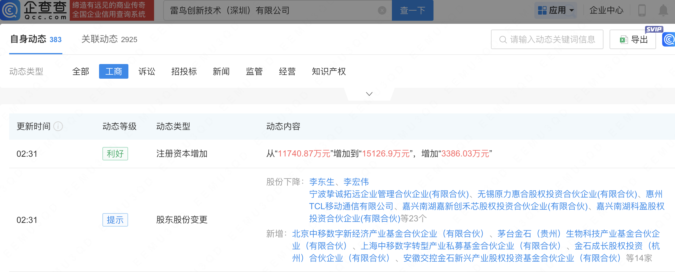 企查查APP显示,近日,雷鸟创新技术(深圳)有限公司发生工商变更,新增茅台金石(贵州)生物科技产业基金合伙企业(有限合伙)、北京中移数字新经济产业基金合伙企业(有限合伙)、上海中移数字转型产业私募基金合伙企业(有限合伙)等为股东,同时注册资本增至1.51亿元。企查查信息显示,该公司成立于2021年,经营范围包含:可穿戴智能设备制造;虚拟现实设备制造;人工智能基础软件开发;集成电路销售等。公开信息显示,雷鸟创新是一家AR眼镜研发商。